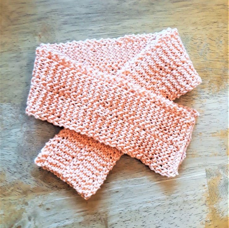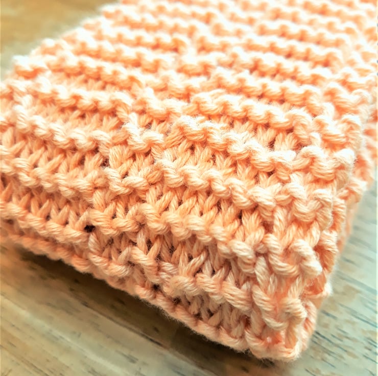 Hand knitted 100% organic cotton in a naturally dyed peach (pale orange) colour.