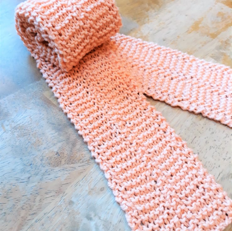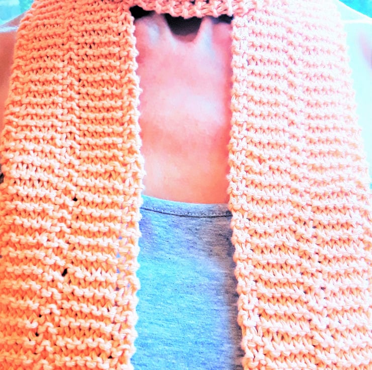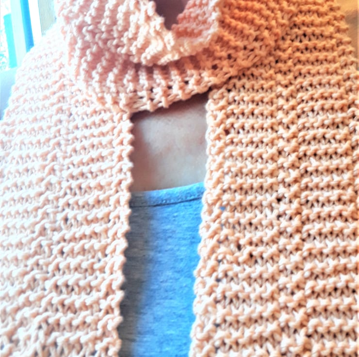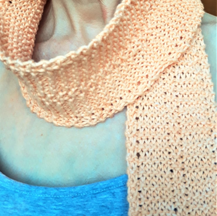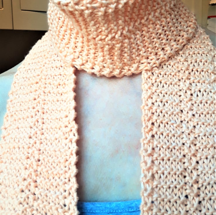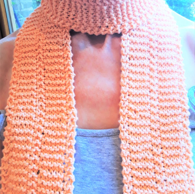 A skinny knit scarf in pure organic cotton with a naturally dyed peach colour.
