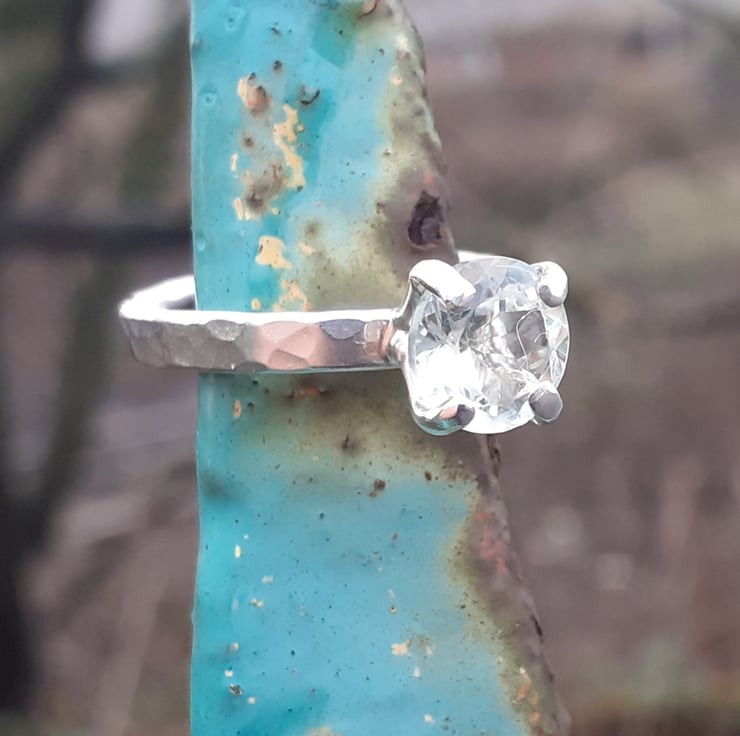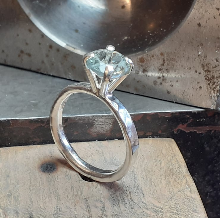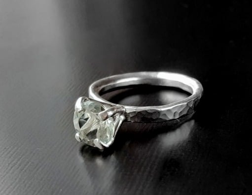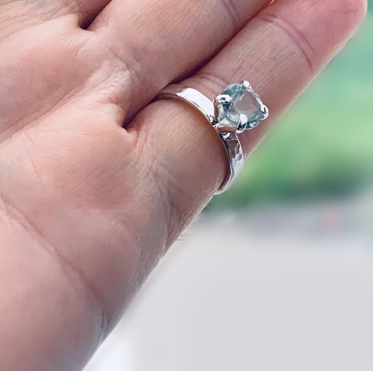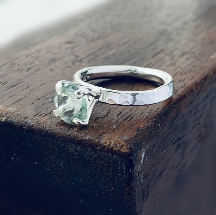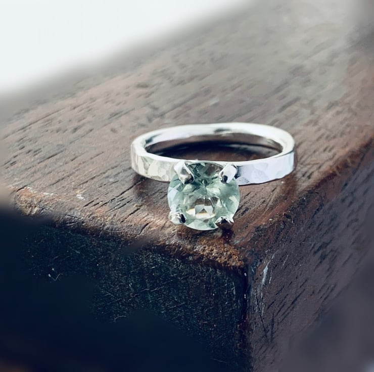 Solitaire designed ring, hammered textured band made from recycled sterling silver, embellished with a 8 mm round faceted green quartz gemstone.