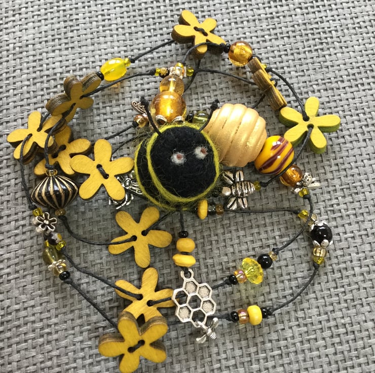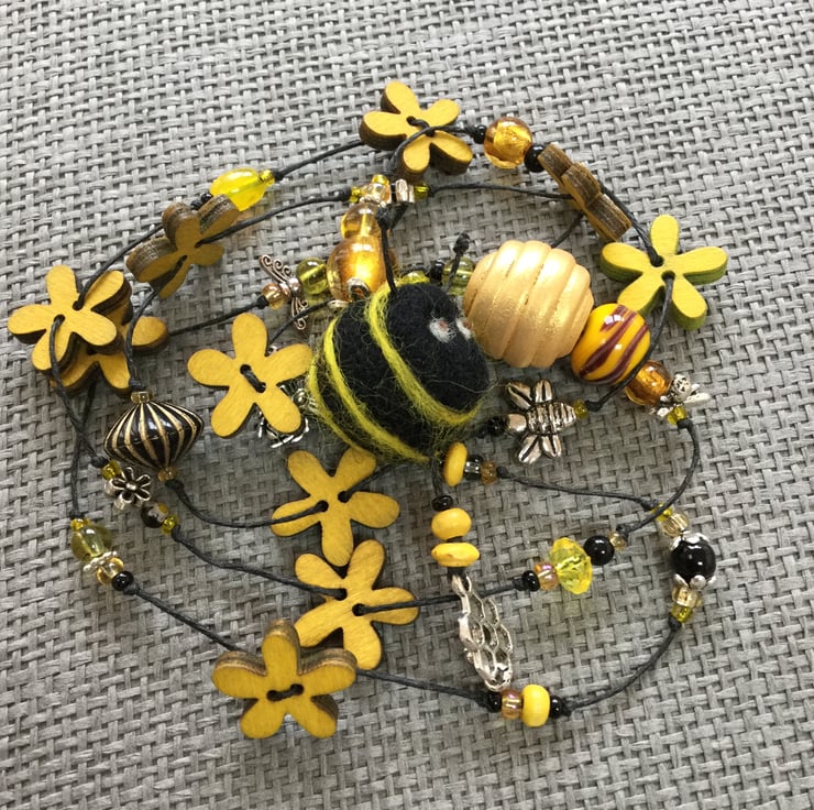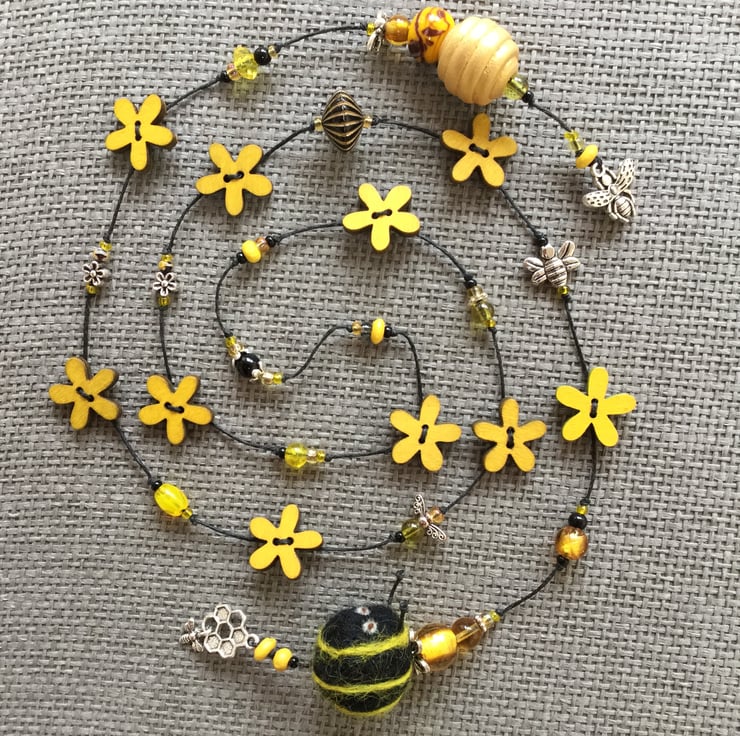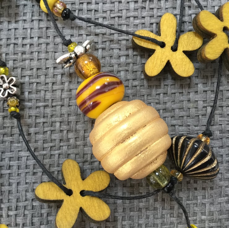 Lariat necklace featuring flower and bee beads and charms in yellow, amber, black and silver, all strung on a waxed linen thread. The beads are a wonderful mixture of textures and colours, including wooden flowers, gorgeous foil glass beads, millefiori, a hand painted wooden honey-pot, a striking yellow and brown glass bead handmade by Nadege de la Garde (IG account: nadege2798) and a cheeky felt bumble bee, all strung on a waxed linen thread.