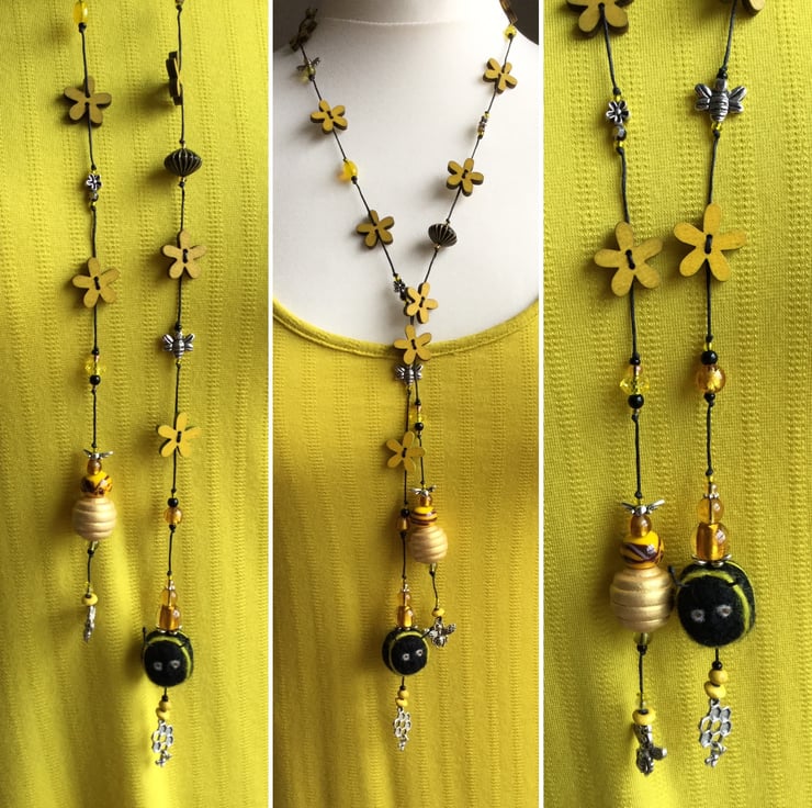 The felt bumble bee is approx 25mm in diameter. The whole necklace is approx 99 cm long.