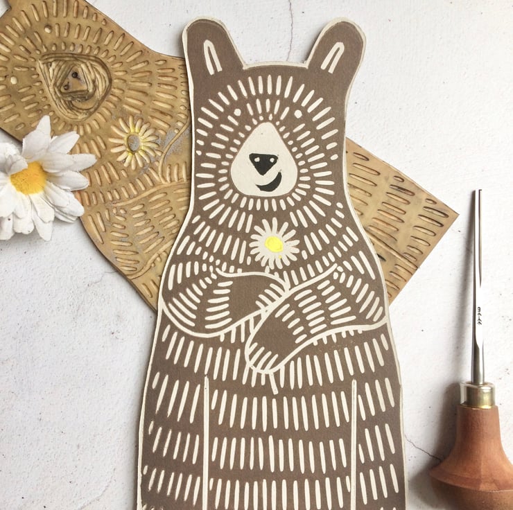 My 3D bear cards have proved to be very popular. This latest open edition is another friendly fellow clutching a single daisy and looking suitably sweet! I've hand printed these bears in eco friendly nut brown ink on to recycled ash grey card and hand cut them out. I think he would be great to give for any occasion, particularly birthdays or as a thank you, but the reason is up to you... He measures approximately 21cm x 11cm and come complete with slot in legs (so he's posted out flat) and a brown Kraft envelope. He looks very at home on a shelf or mantlepiece and should be kept for a long time to come. Sent in First Class post with love from Manchester xx