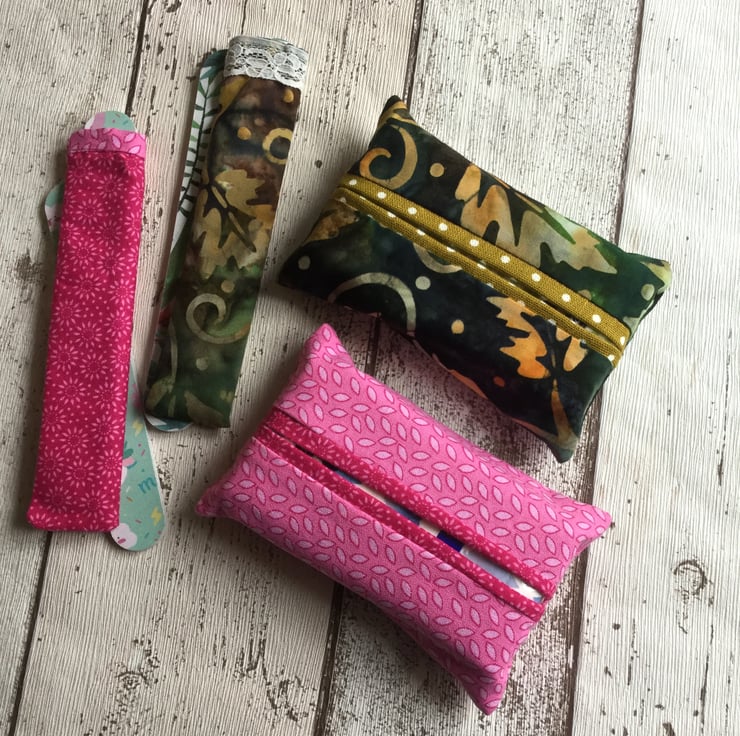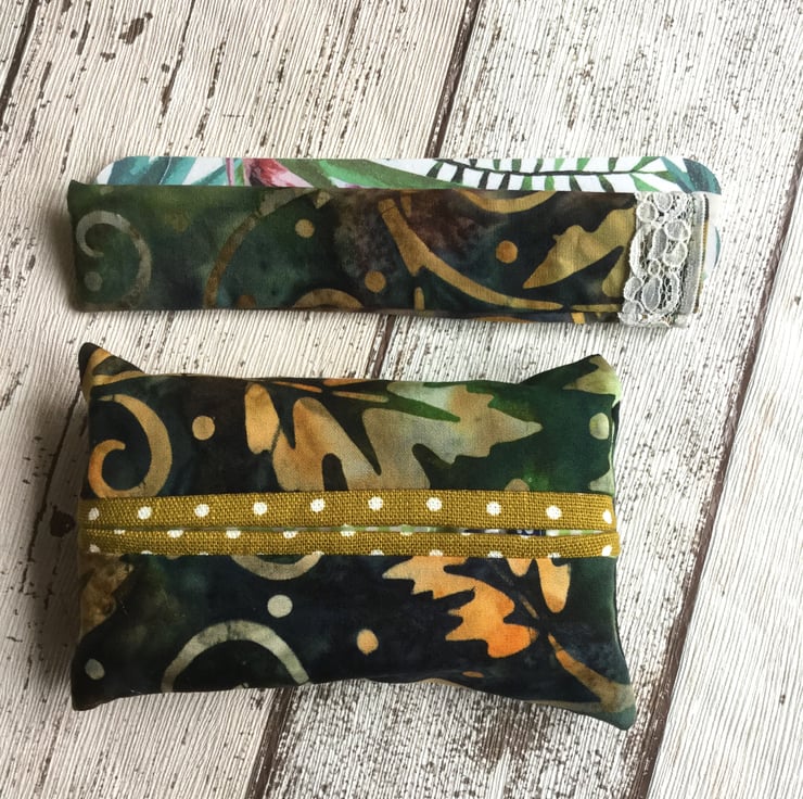 The batik set in shades of deep green and orange and the lining for the tissue holder is a mustardy green colour with a white spot design. The nail file holder has a white lace decoration and the two disposable nail files have a flamingo design.