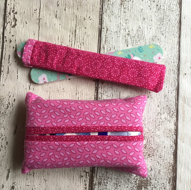 These two sets are perfect for sharing, keep one and give one to a friend or keep for a stocking filler. The pink set is made from a deep pink cotton with a sun flower design and a paler pink with a leaf pattern. The tissue holder holds a basic hand pack and the nail file comes with 2 disposable nail files with a fun unicorn design on.