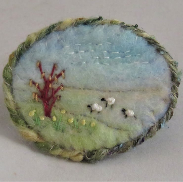 The background of the brooch has been created from hand-dyed fibres felted to a layer of fleece fabric. The sheep and daffodils have been stitched in wools and embroidery threads.
