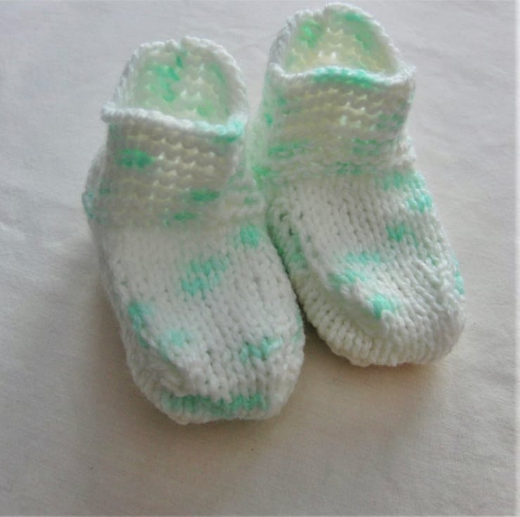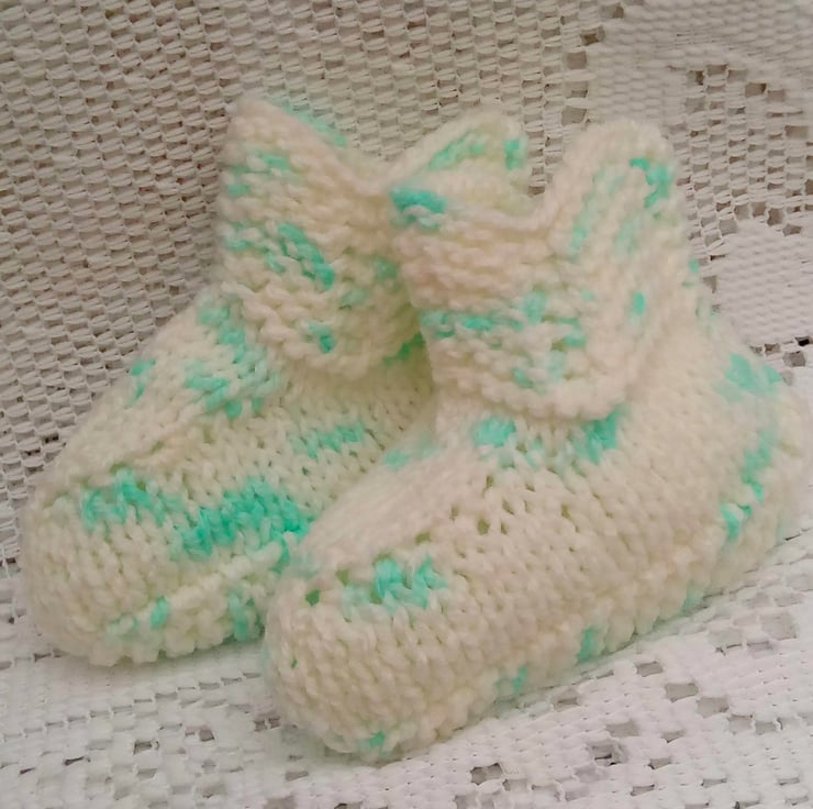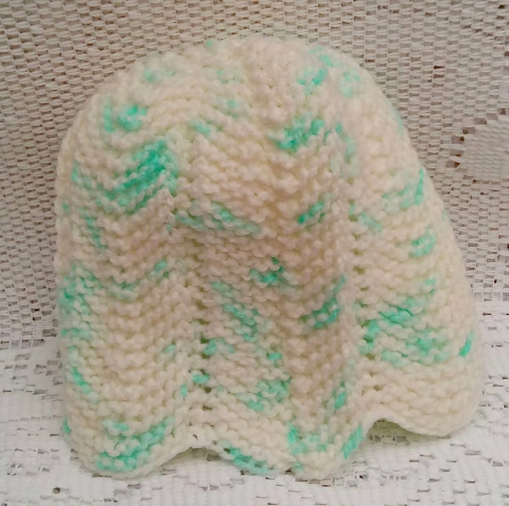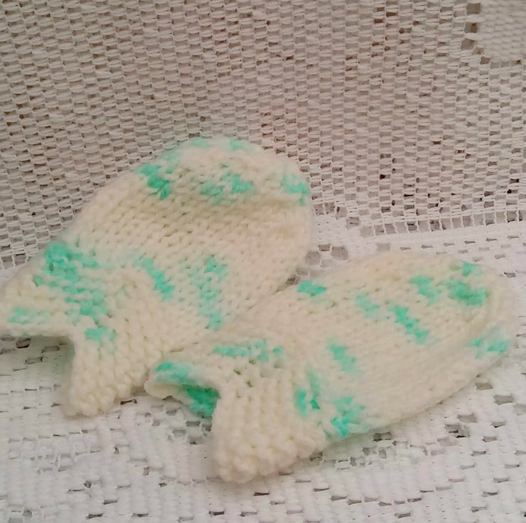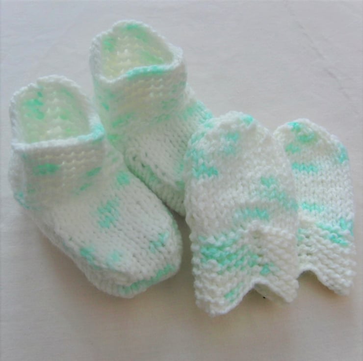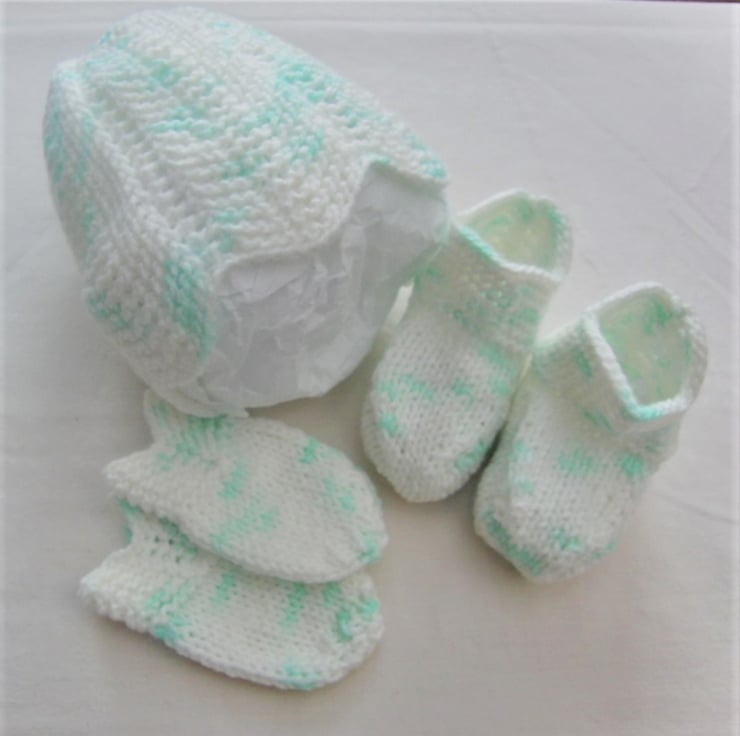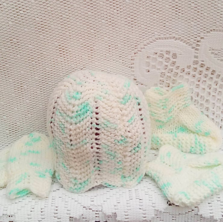 Pretty hat set , including a hat, a pair of bootees and a pair of mittens. The set is made to fit a child approximately 0 - 3 months old and is knitted in Green flecked double knitting weight yarn.