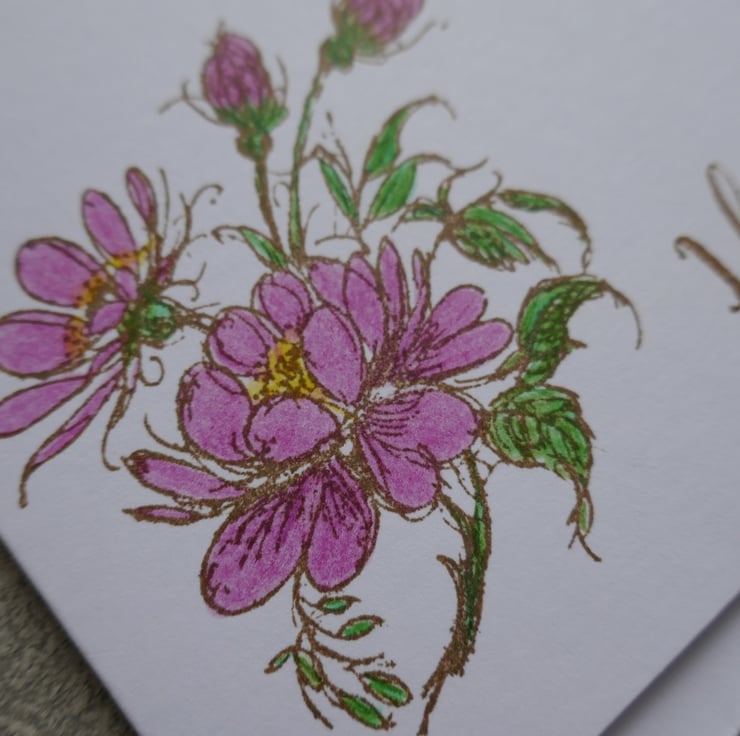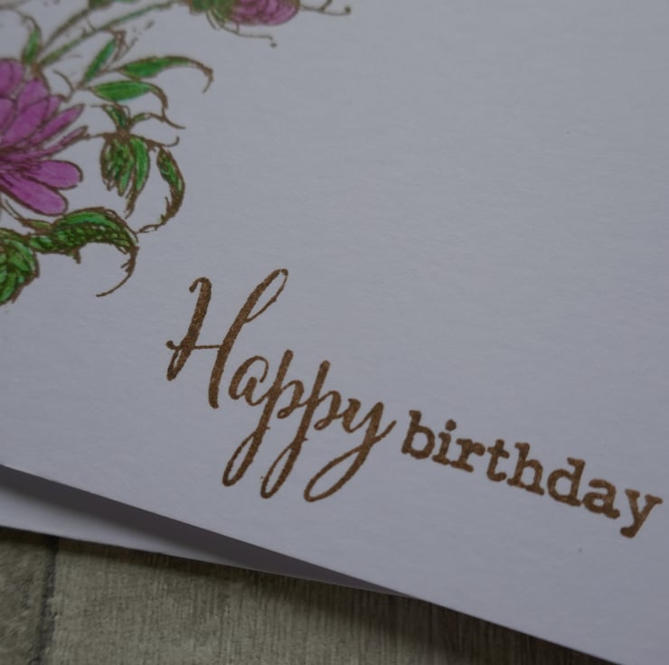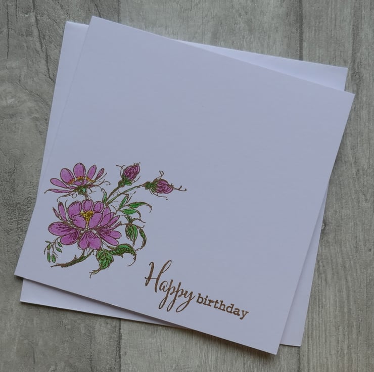 The card measures approximately 6" x 6" and is made from white matt card. The floral image has been stamped in brown ink in the lower corner of the card with the sentiment 'Happy birthday' stamped along the lower edge. The flowers and leaves have been coloured with coloured pencils - the flowers are pink with yellow centres and the leaves are bright green.