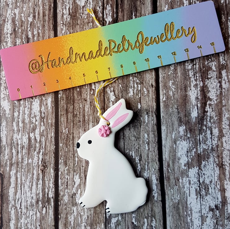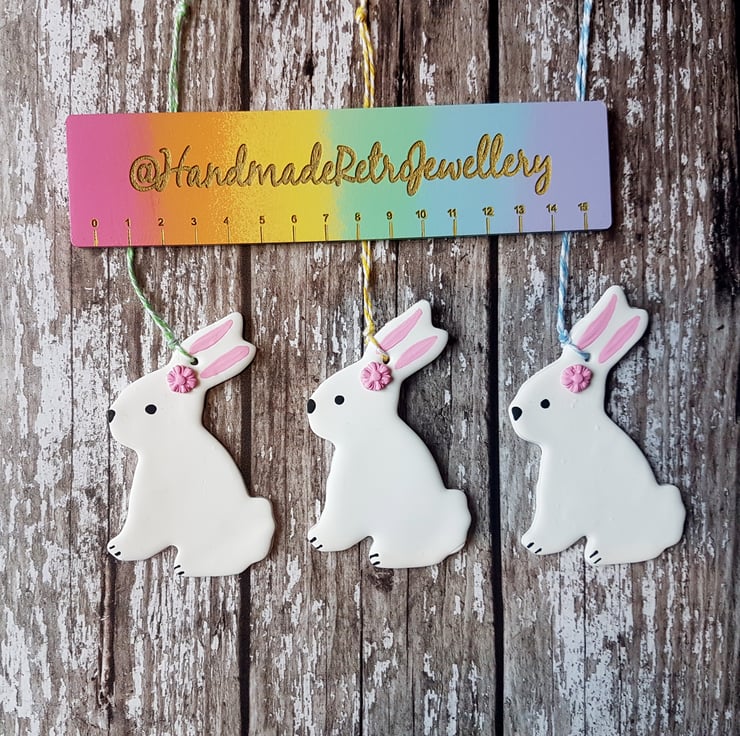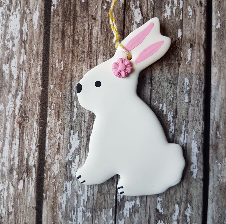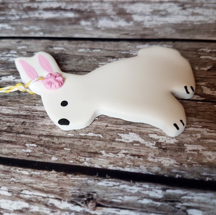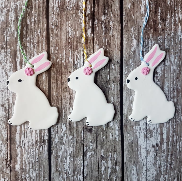 These cute little Easter bunnies are made of polymer clay (including a dainty little pink flower on their head) with detail hand painted using acrylic paint to finish.