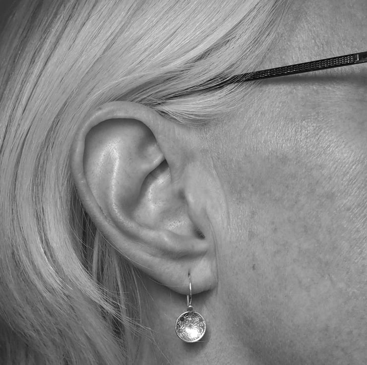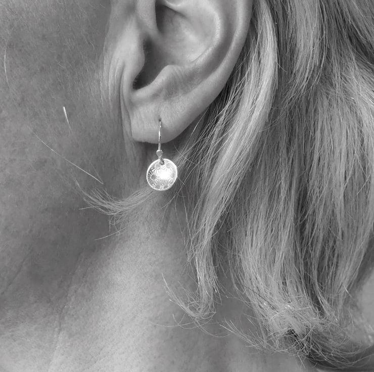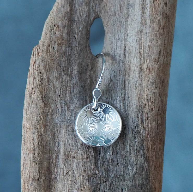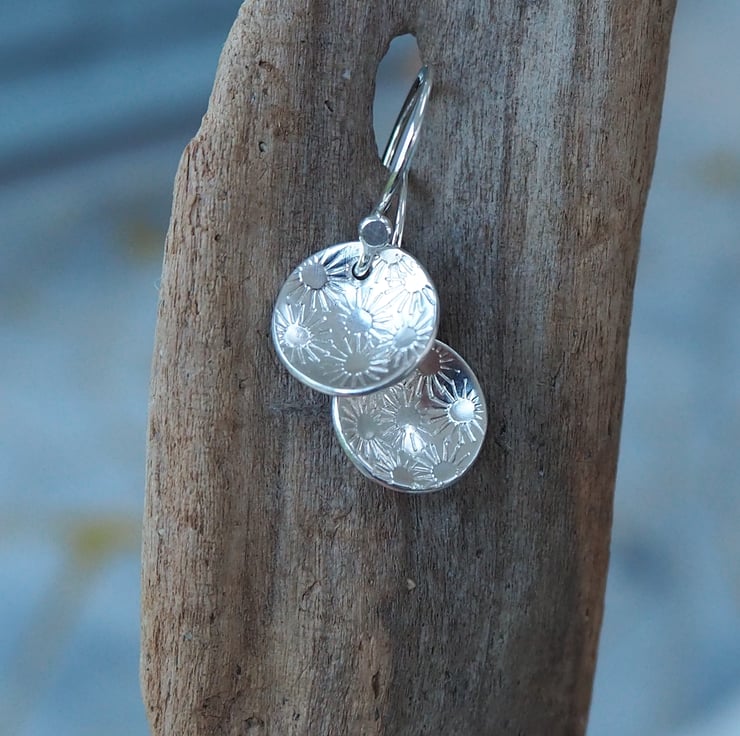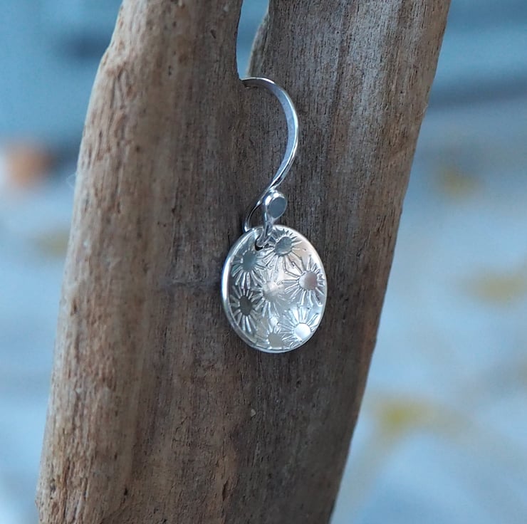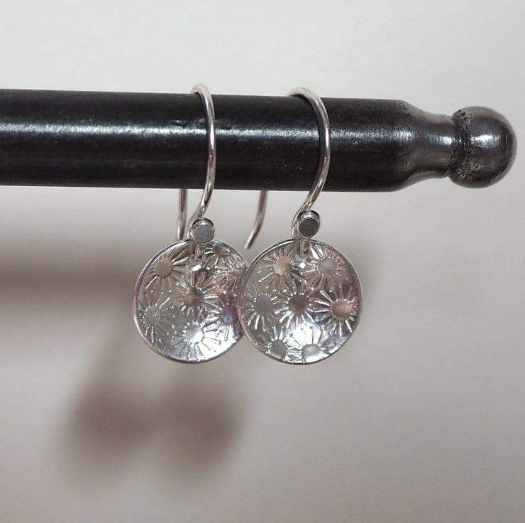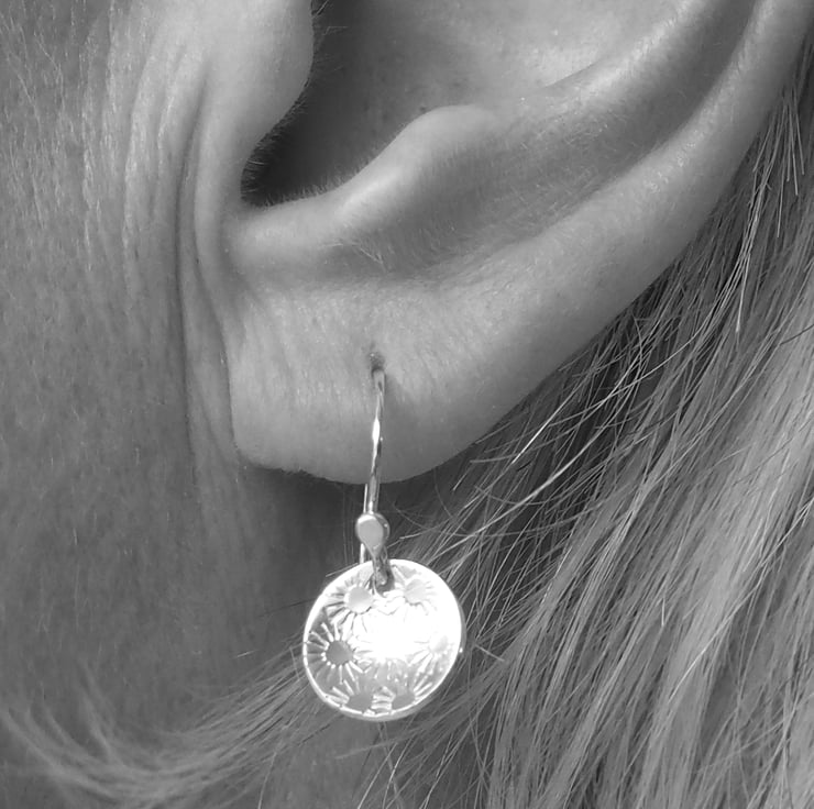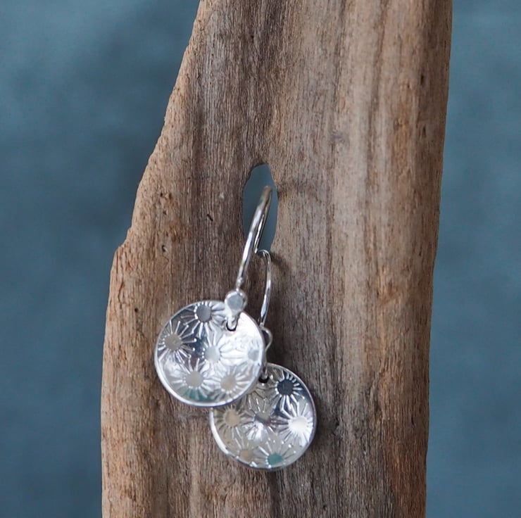 A pretty bunch of daisies has been punched into discs of silver to give a pretty surface texture for these lovely drop earrings.