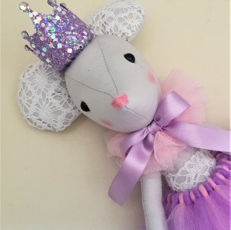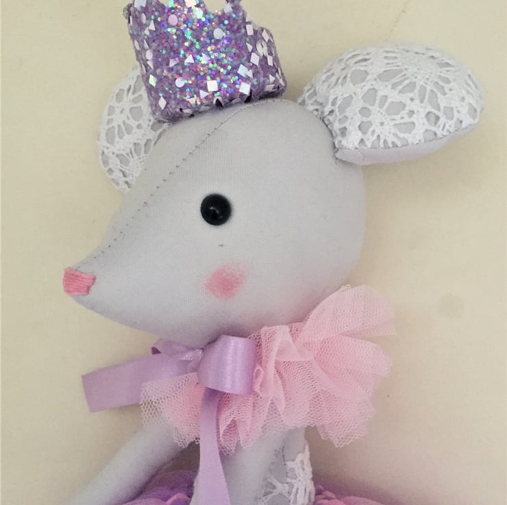 Ballerina mouse with sparkly crown and pretty tutu. Handmade with love and care from the best quality fabrics and stuffed with polyester fibrefill.