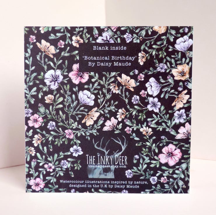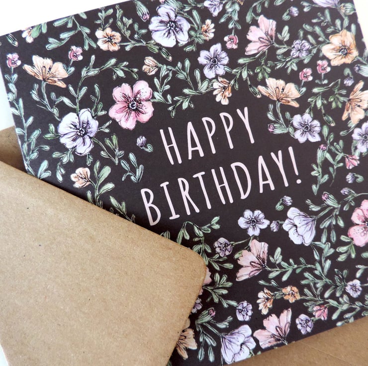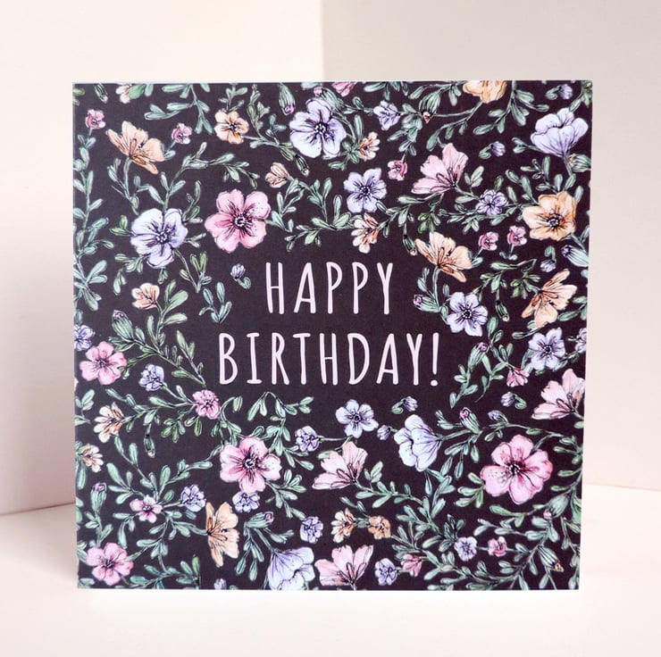 Bold floral greetings card featuring an allover botanical pattern with foliage on a black background, from my original watercolour design. With 'Happy Birthday!' on the front.