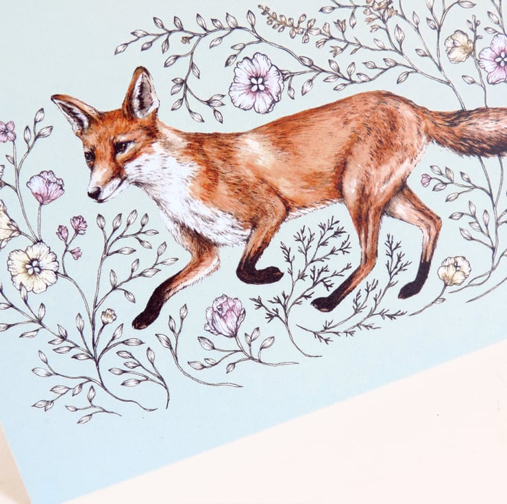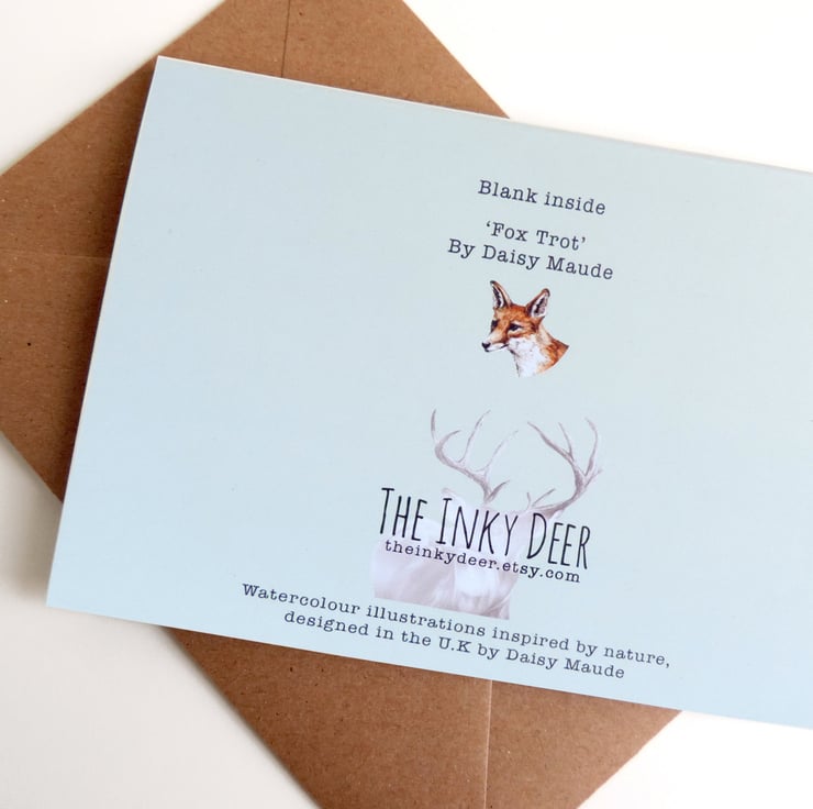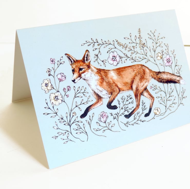 Greetings card featuring my watercolour and ink fox illustration 'Fox Trot' , surrounded by wildflowers and foliage on a soft green background. Perfect for the nature or animal lover in your life!