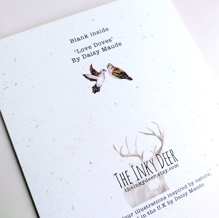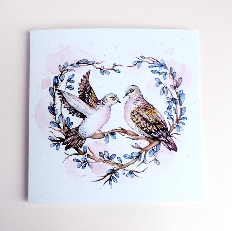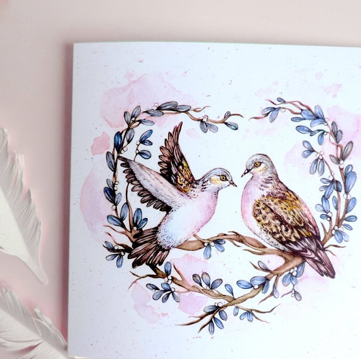 Greetings card featuring my 'Love Doves' watercolour. Turtle doves are believed to be a symbol of love and friendship. Perfect to celebrate an anniversary, wedding, or valentines. Whatever the occasion, the card is blank inside for you to add your own message.