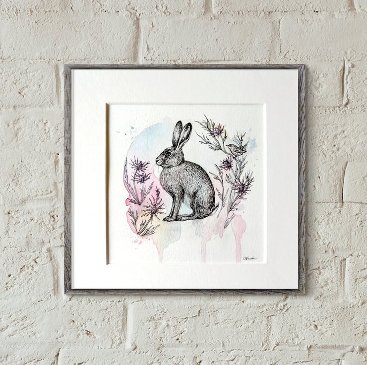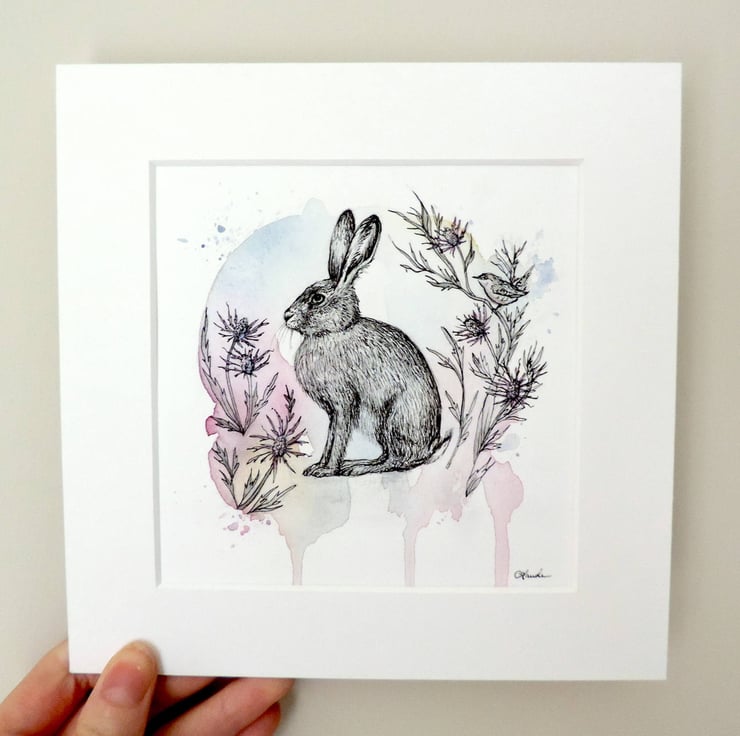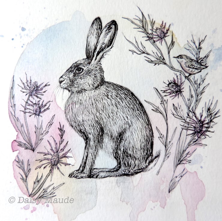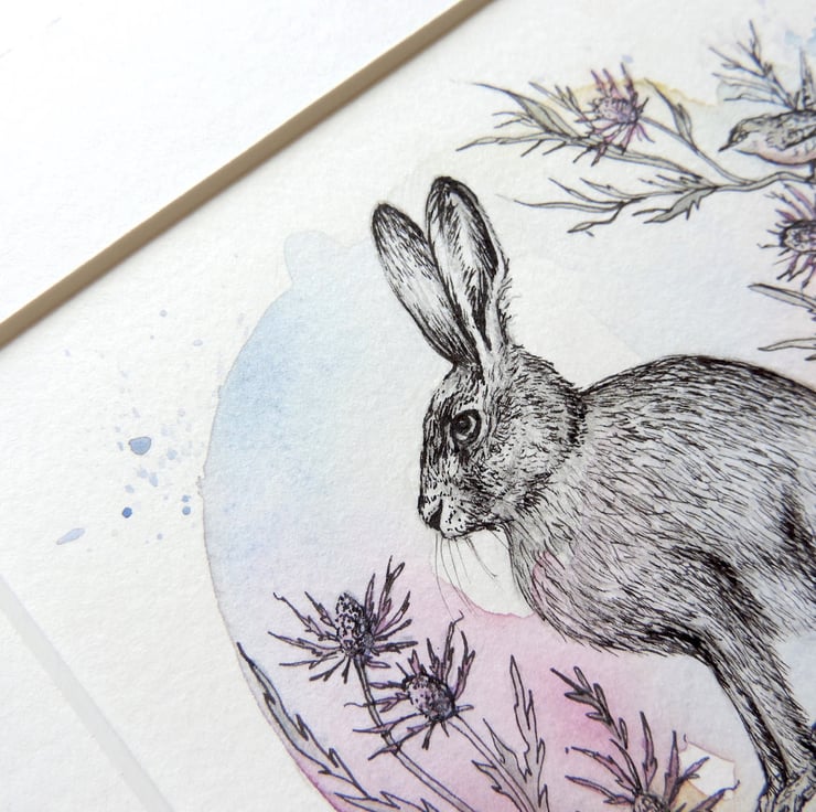 Original illustration 'Hare with sea hollies' created with watercolour, and ink with subtle iridescent two tone pinkgreen detils on the foliage.