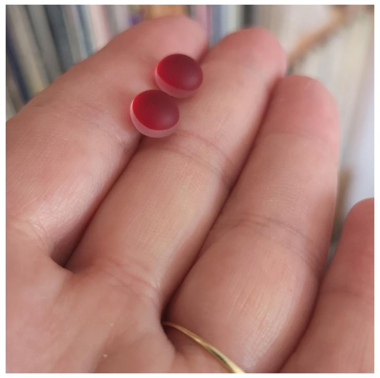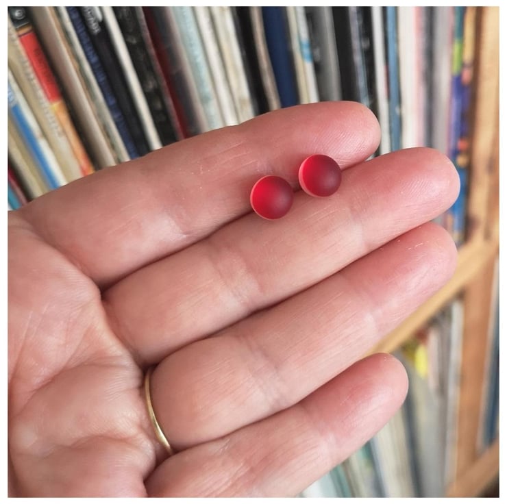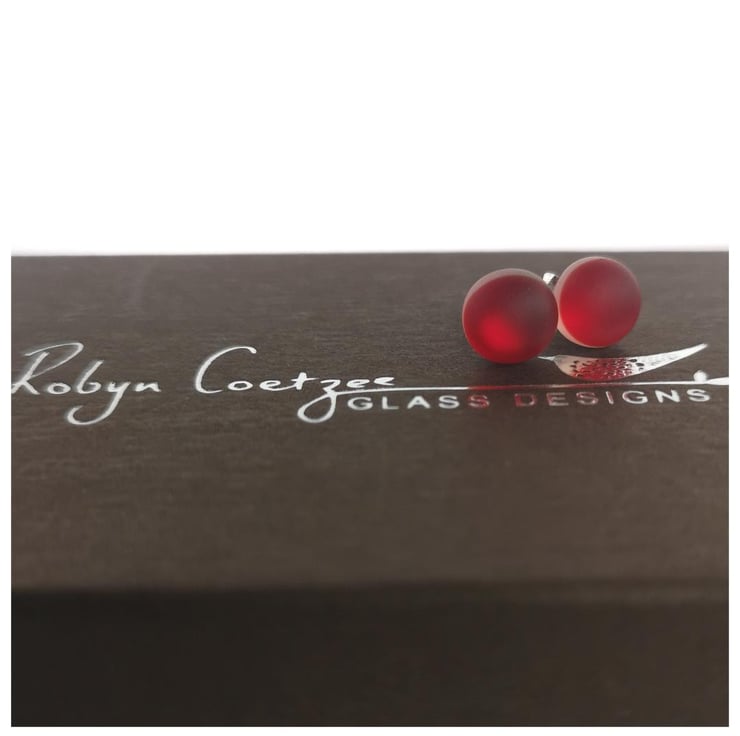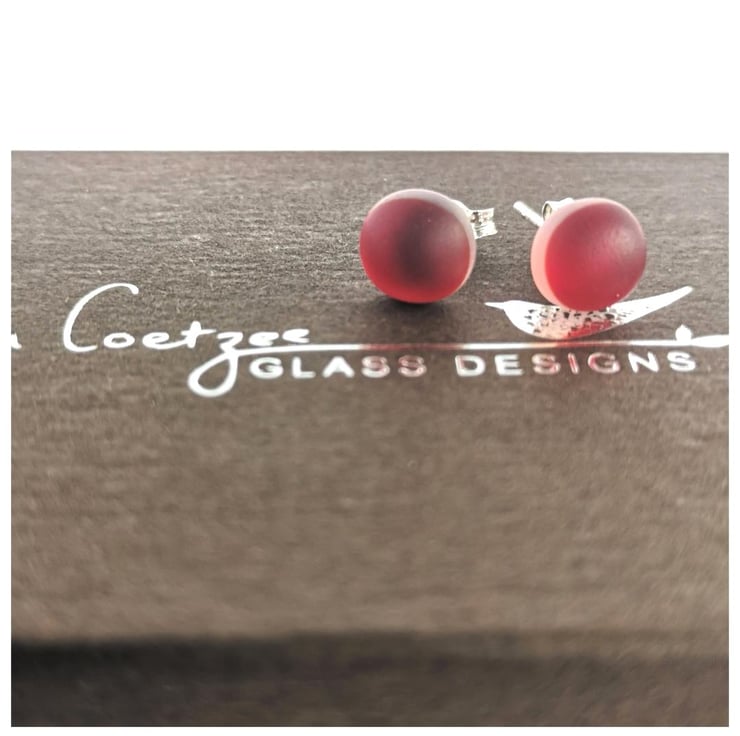 This listing is for a pair of rich-red frosted glass stud earrings with sterling silver posts. They have a matt texture. The colour is a slightly deeper red in real life.