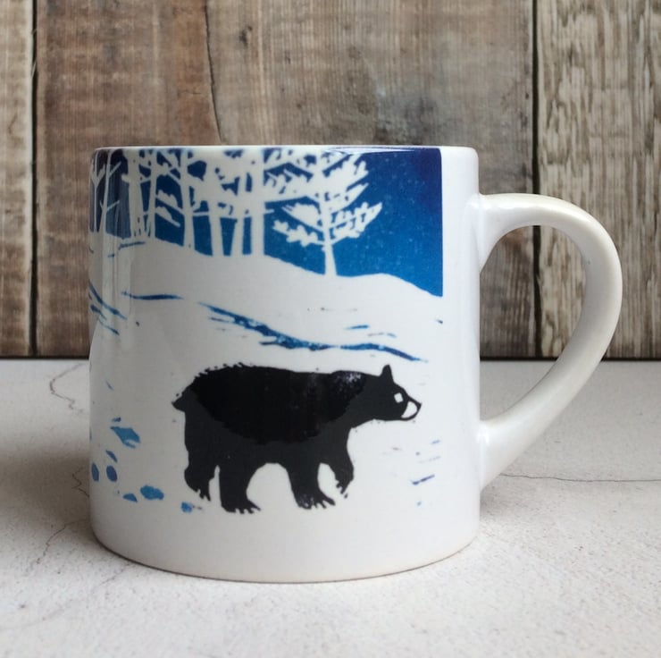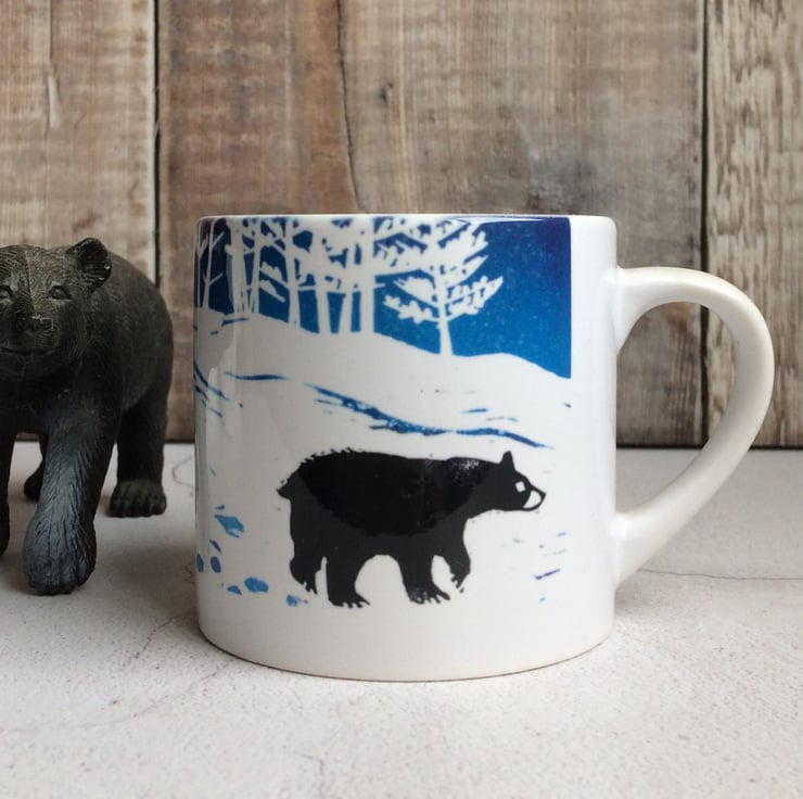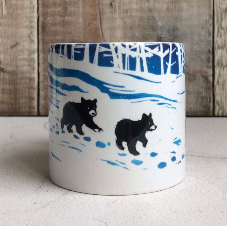 A mother bear and her three cubs are on the move. This design is taken from an original Lino print triptych also available in my Folksy shop. The mug holds 200ml of your favourite drink, a perfect size for a coffee or a delightful first mug for a child. It is safe to hand was or pop in the dishwasher and will be sent carefully packaged ready to give... or keep.