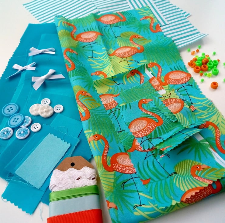 Ribbons, bows, buttons and beads mix and match with the plain and striped fabrics which in turn co-ordinate perfectly with the vibrant orange flamingos on a background of lush tropical green leaves.
