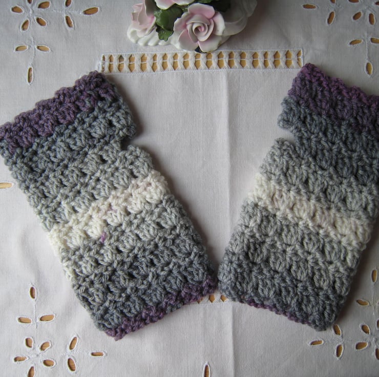 These fingerless gloves are made from premium acrylic yarn, sourced from other small businesses wherever possible. They allow the wearer to drive, text, type, use various devices and other tasks – even crochet – whilst still keeping the hands warm. They make great presents for any women in your life. They are machine washable, with care. They originate from a smoke-less, pet-free location.