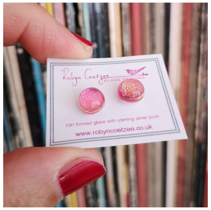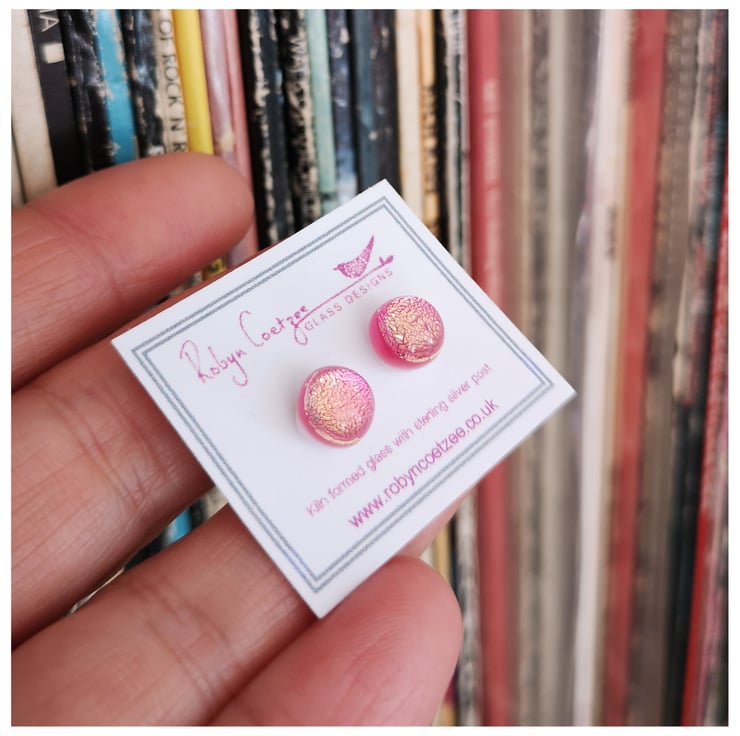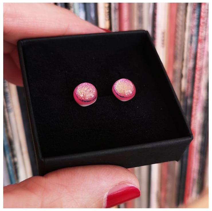 This listing is for a pair of small pink dichroic glass stud earrings with sterling silver posts. They shift between a pink and subtle golden yellow and are on a pink and white background.