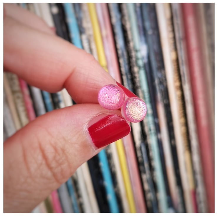 I love making little stud earrings with dichroic in them as they shift in colour as you move your head. Little flashes of delight.