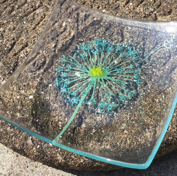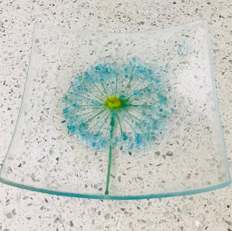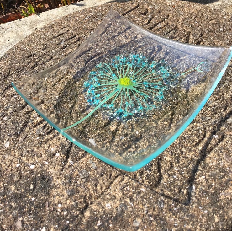 Dandelion style decoration in fused glass trinket dish approx4 inch square . Curved bottom . Ideal jewellry dish or decorative side dish . This design is beautiful and delicate . Slight design variations are to be expected due to the handmade nature . Blue may also vary due to availability but always aqua or blue