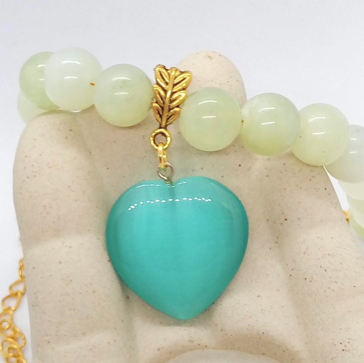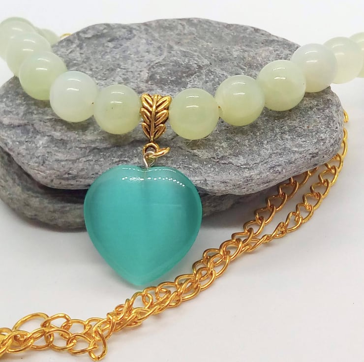 Teal Glass Heart Pendant on a Jade Bead and Gold Chain Necklace, Birthday Gift, Anniversary Gift, Mother's Day Gift, Gift for Her, Semi Precious Jewellery