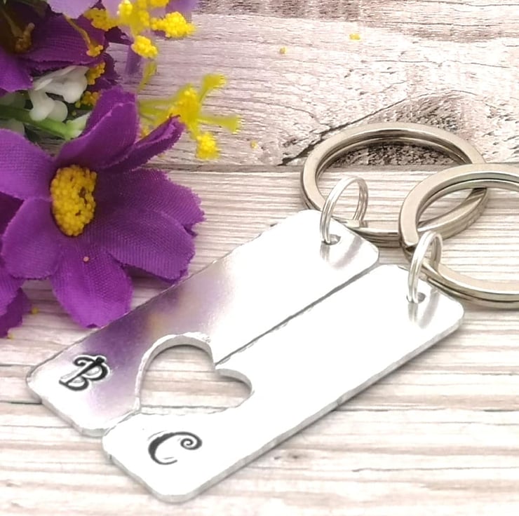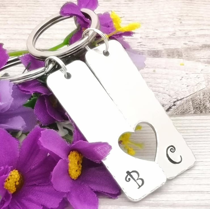 This pair of keyrings will be made to order by hand stamping each individual letter onto each piece of blank aluminium metal. They are then polished and finished by painting each letter with black ink.