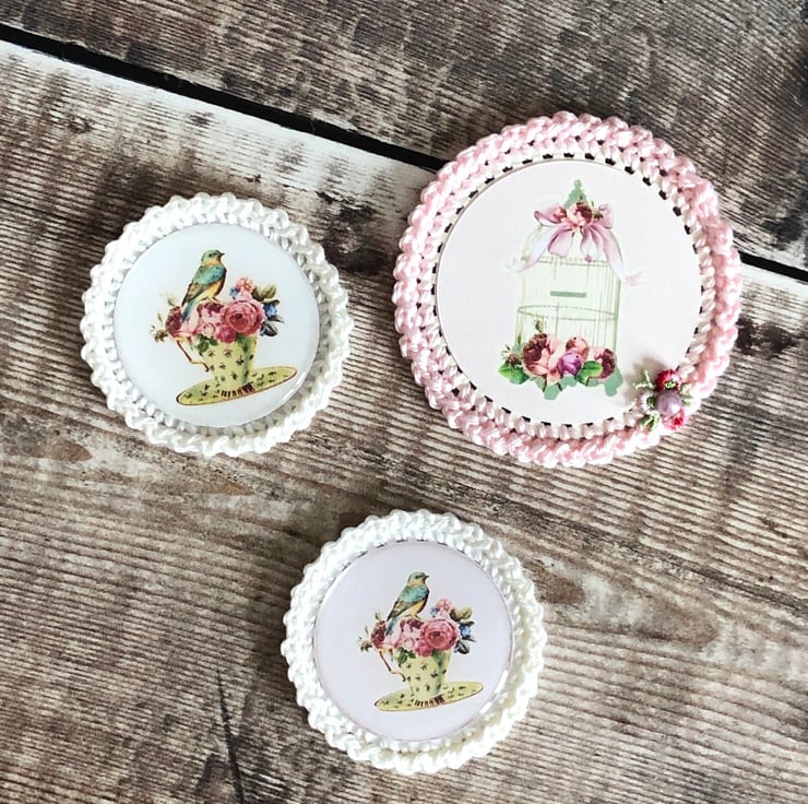 3 x of my hand crocheted circle images (the 2 x smaller ones have clear resin epoxy dome stickers over the top)