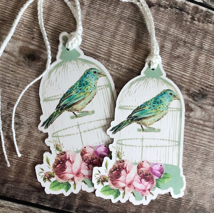 2 x beautiful birdcage shaped tags with hand crocheted string