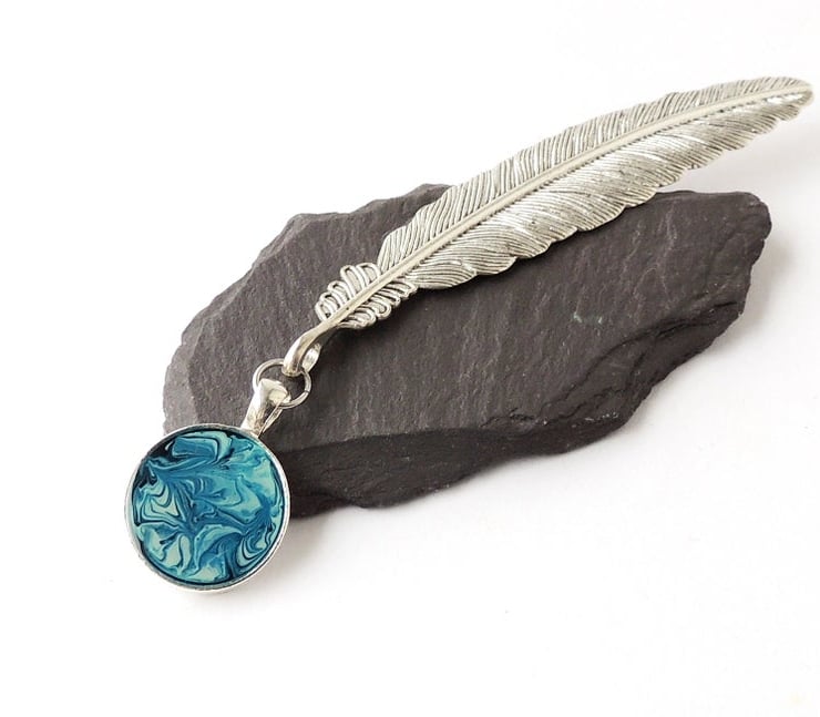 This blue and silver bookmark has a blue marbled colour drop and an antique silver plated feather bookmark.