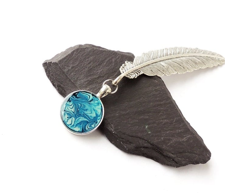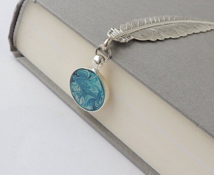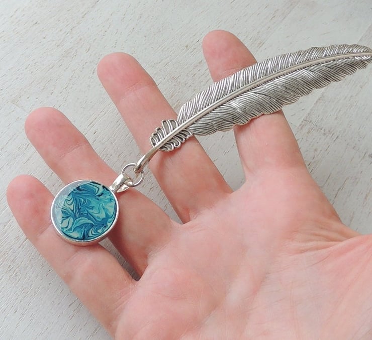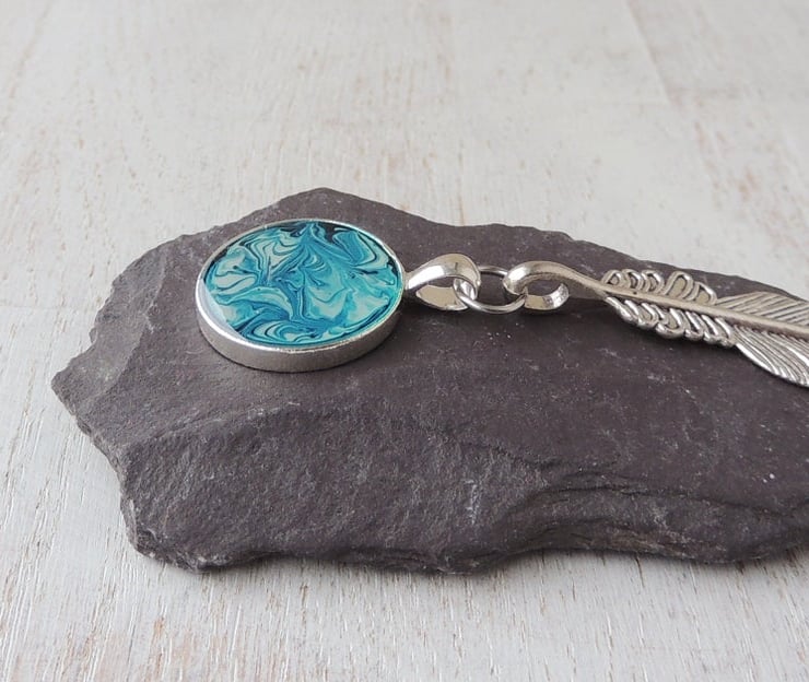 I made the marbled pattern with paints and resin in the cup of a silver plated bezel, finishing with a coat of clear resin. I then attached it to the feather bookmark.