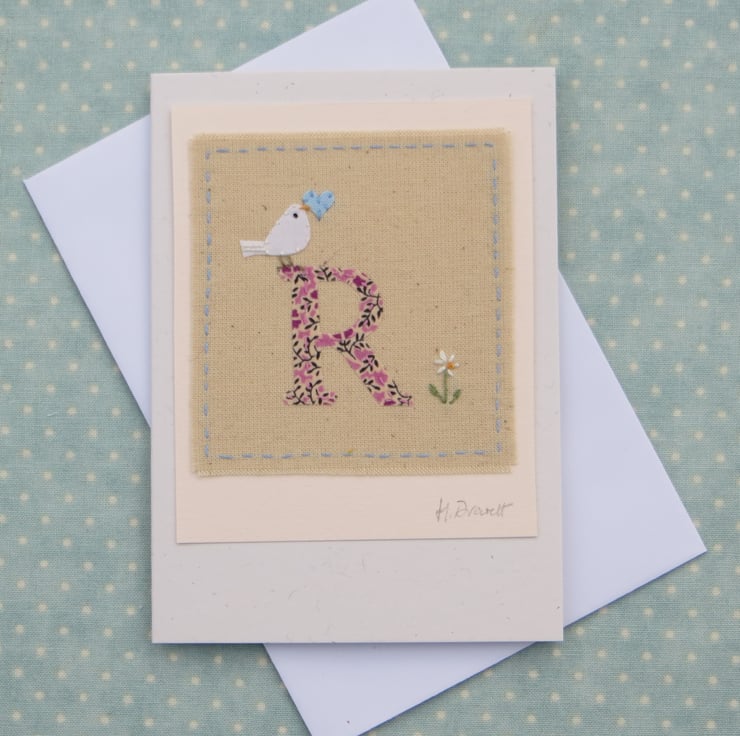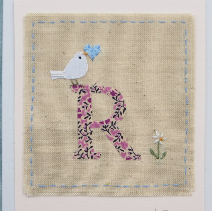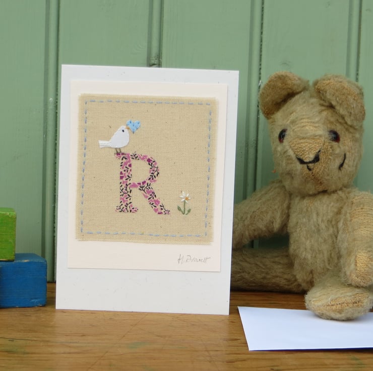 A hand-stitched card with the letter 'R' cut from pretty floral fabric stitched into place with tiny stitches. I have added a miniature applique dove with heart in her beak, and then embroidered a tiny daisy flower to complete the design. (Teddy and blocks not included in the sale!)