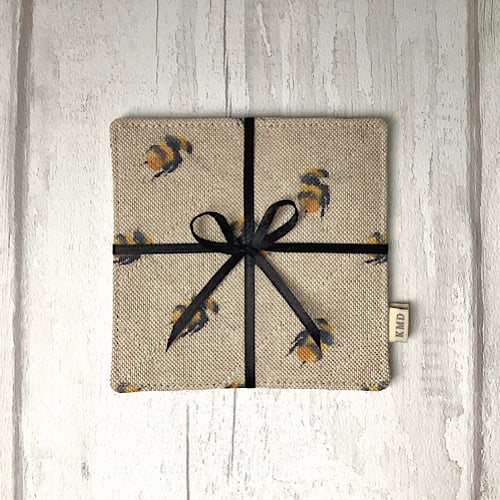 Coaster set (2 pieces) in natural linen with a bee print. Backed in black spot cotton. Quilted and measuring 10cm by 10cm.
