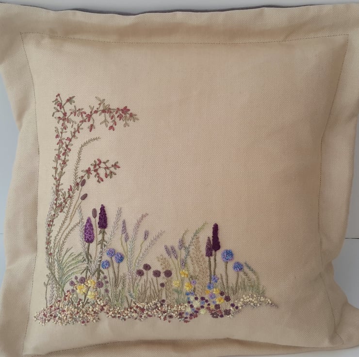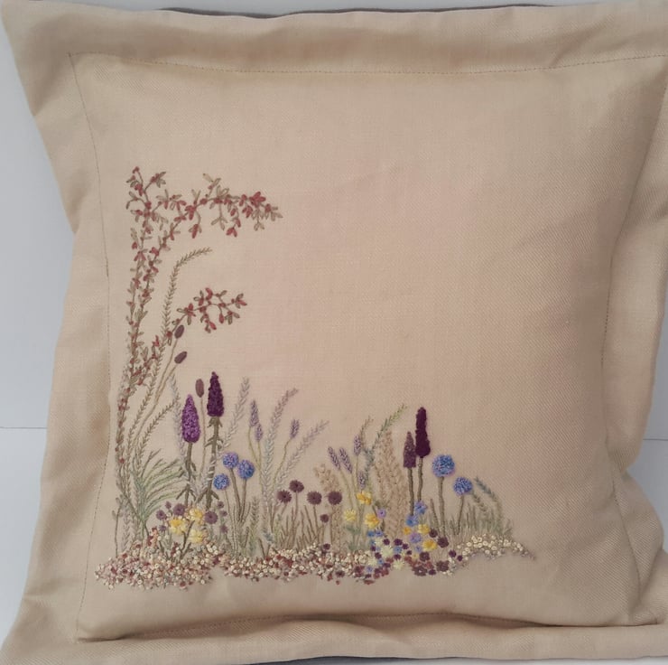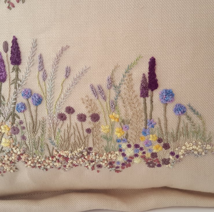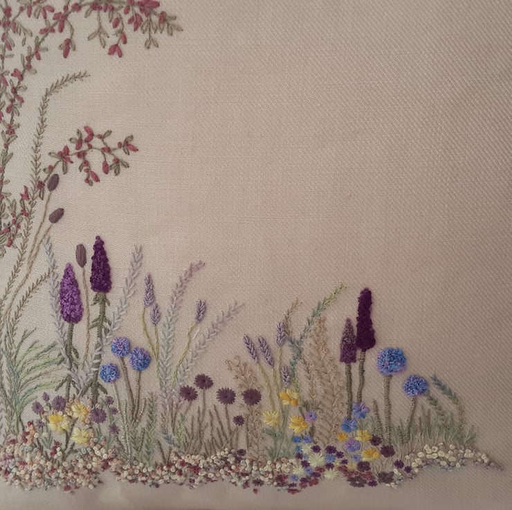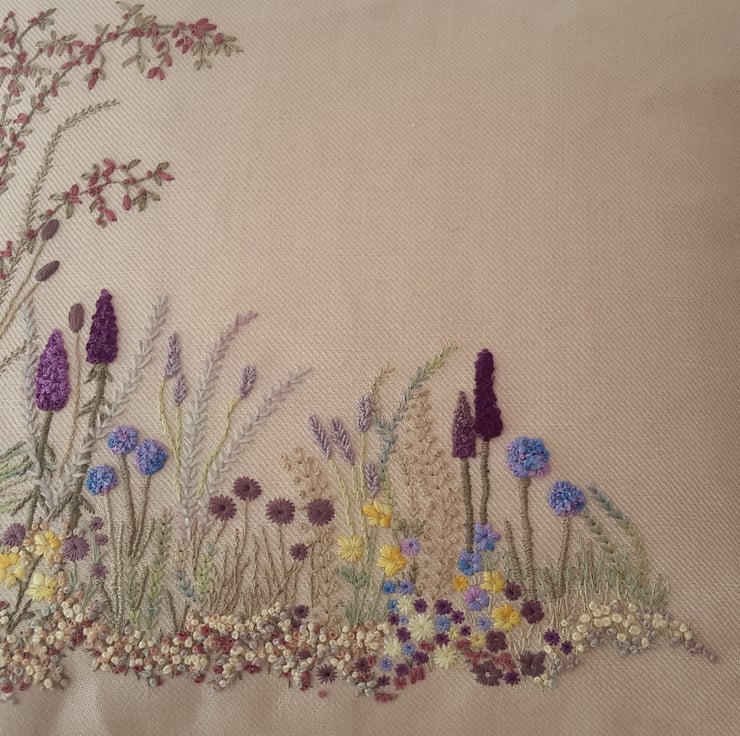 Commission based on my pincushions. A country cottage garden using 1 or 2 strands from 6 stranded DMC cotton thread, perle 12 cotton and a fine hand dyed wool thread and features many grasses and flowers.
