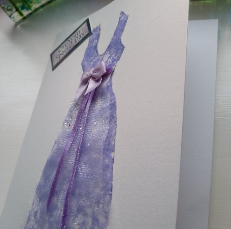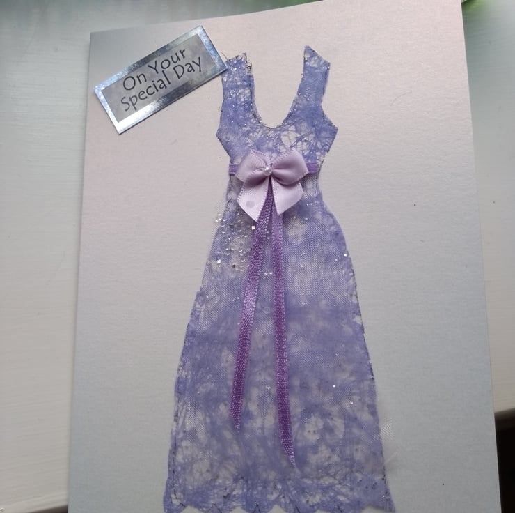 A completely different and uniquely designed card. Consisting of a beautiful dress cut from lilac babies breath topped with silver organza encrusted with tiny 'diamonds'. Mounted onto quality silver pearl card. Finished off with lilac ribbon and bow and 'on your special day' tag