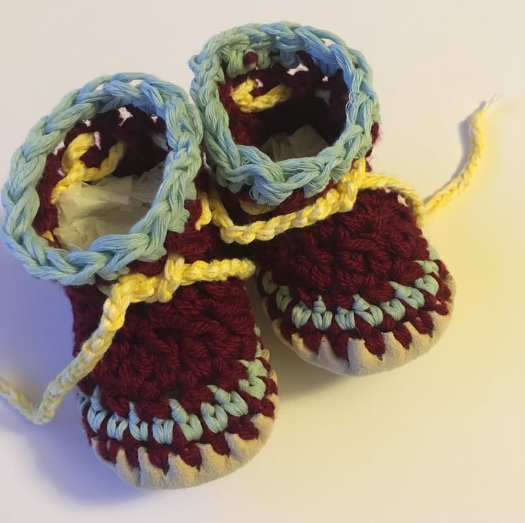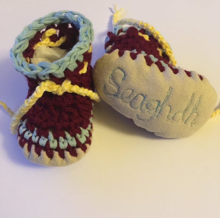 These funky little boots will keep your baby's feet snug and warm, and can be personalised with name embroidered on sole. Warm crocheted fabric with stretch for comfort and growing room plus a soft suede non-slip sole. A perfect gift for a baby boy or girl.