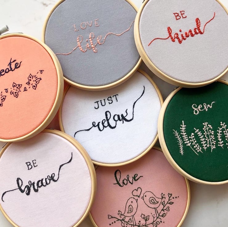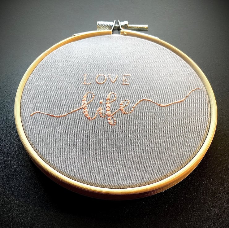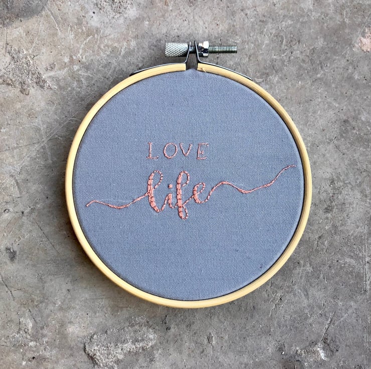 This example is stitched with coral cotton thread onto a light grey 100% cotton fabric and framed in a 4 inch bamboo hoop. The back is finished with grey felt. Perfect for hanging as wall art, or small enough to cluster with other items as a display.