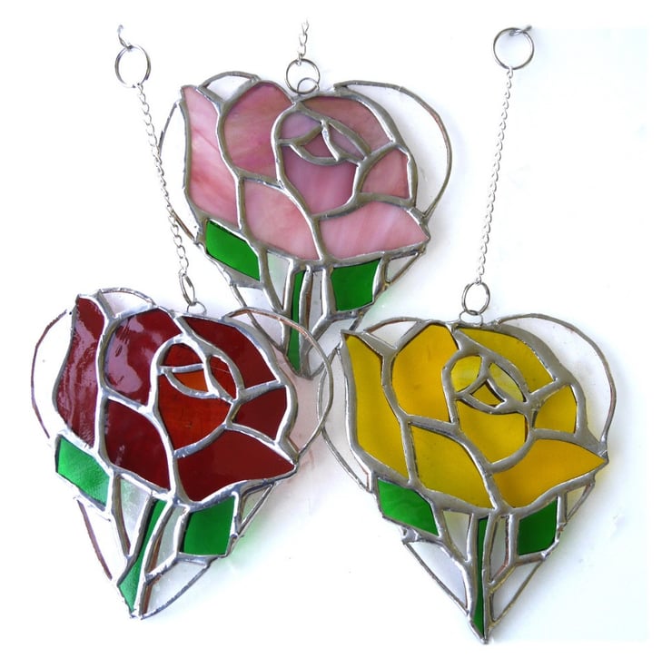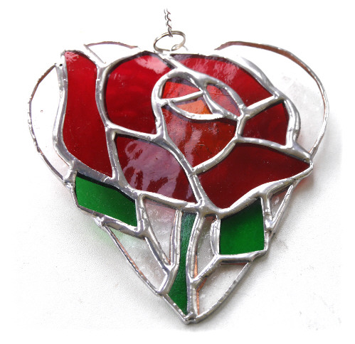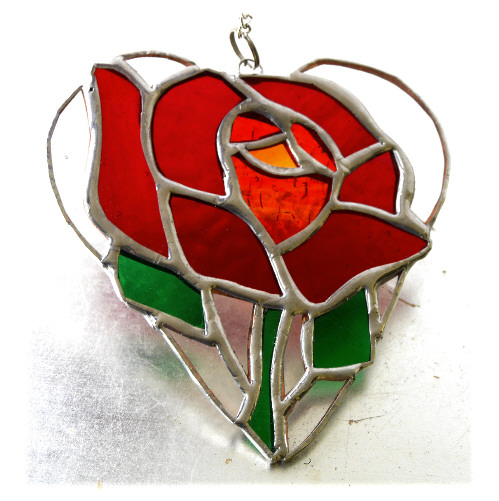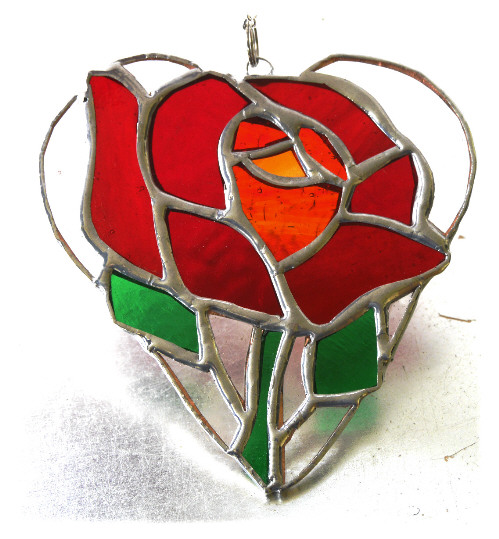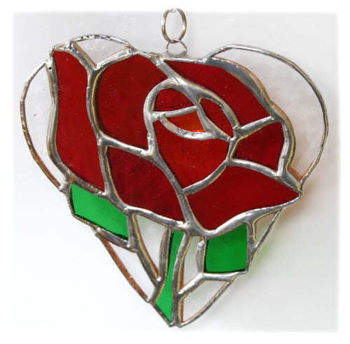 A full bright red rose in a heart, entirely handmade by me to my own Joysofglass design.