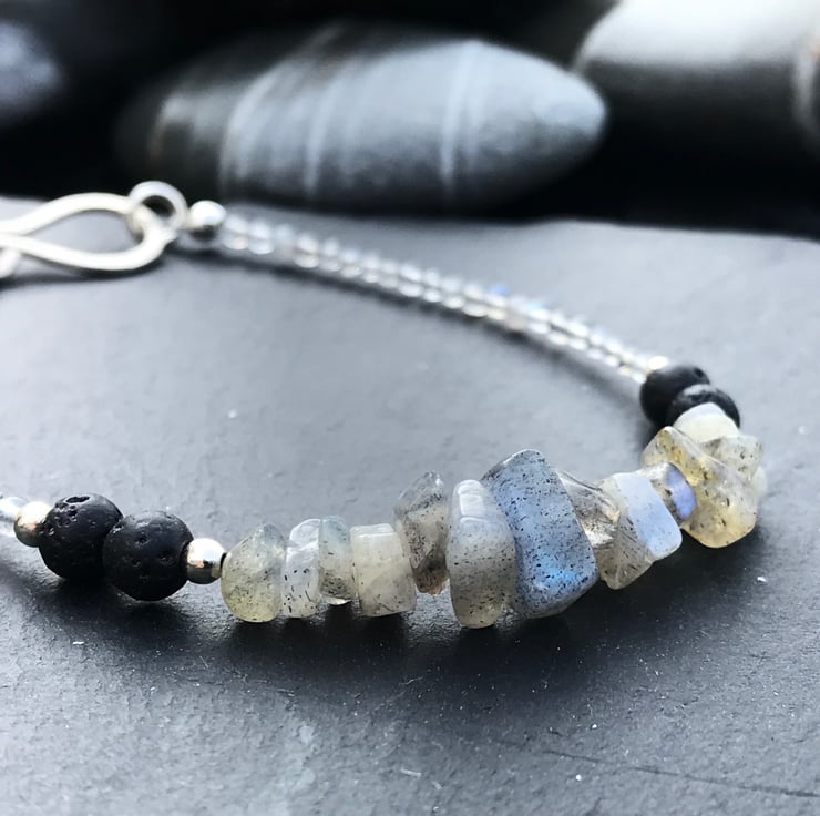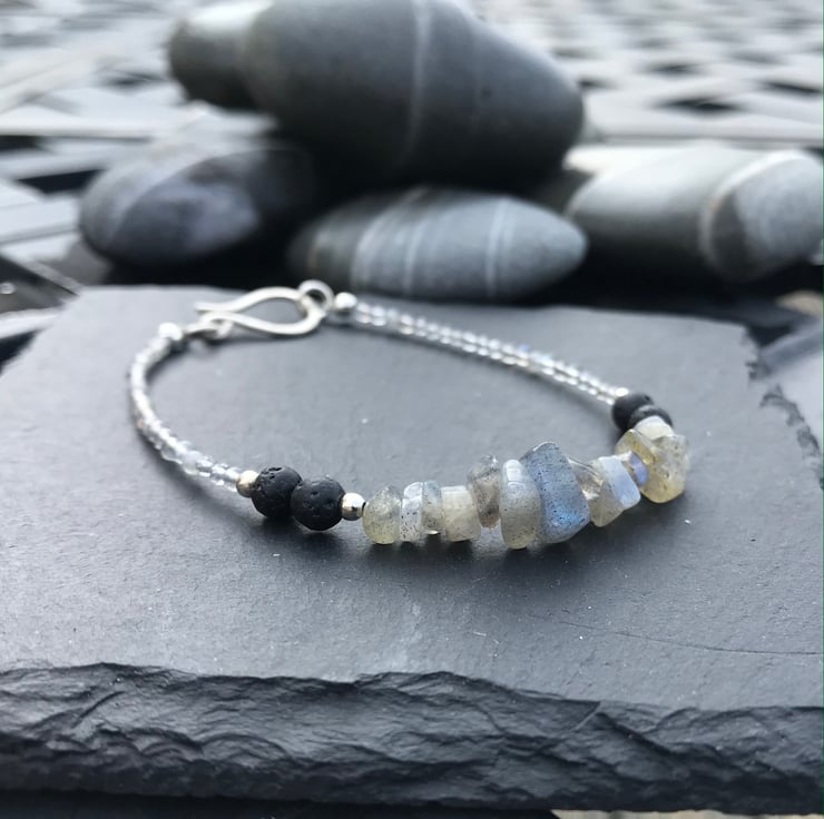 Pretty Labradorite bracelet with Lava stones and a handmade silver textured clasp.