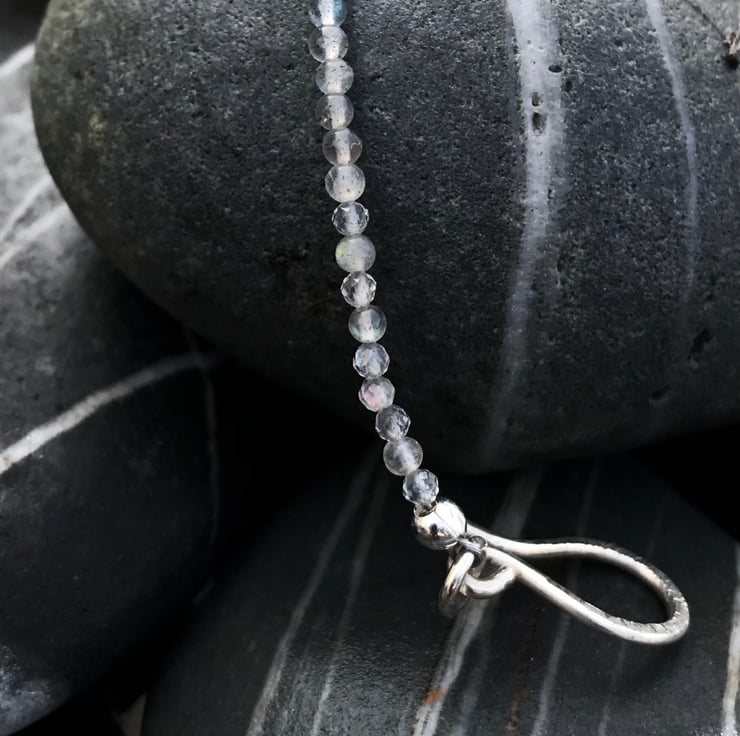 Labradorite is a grounding stone which is a pretty grey colour with amazing blue flashes that catch the light. This one has Labradorite chips with facteted 2mm beads which shine and catch the light.