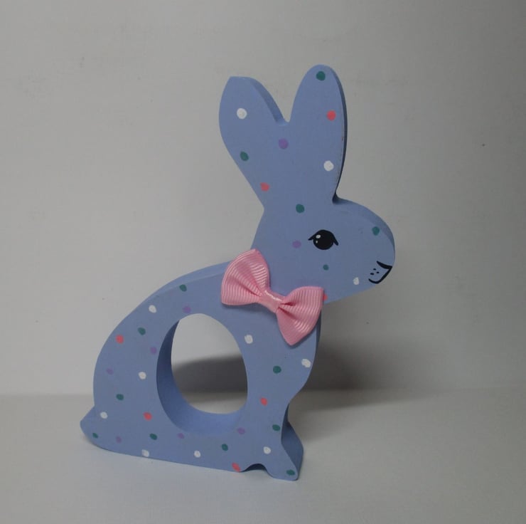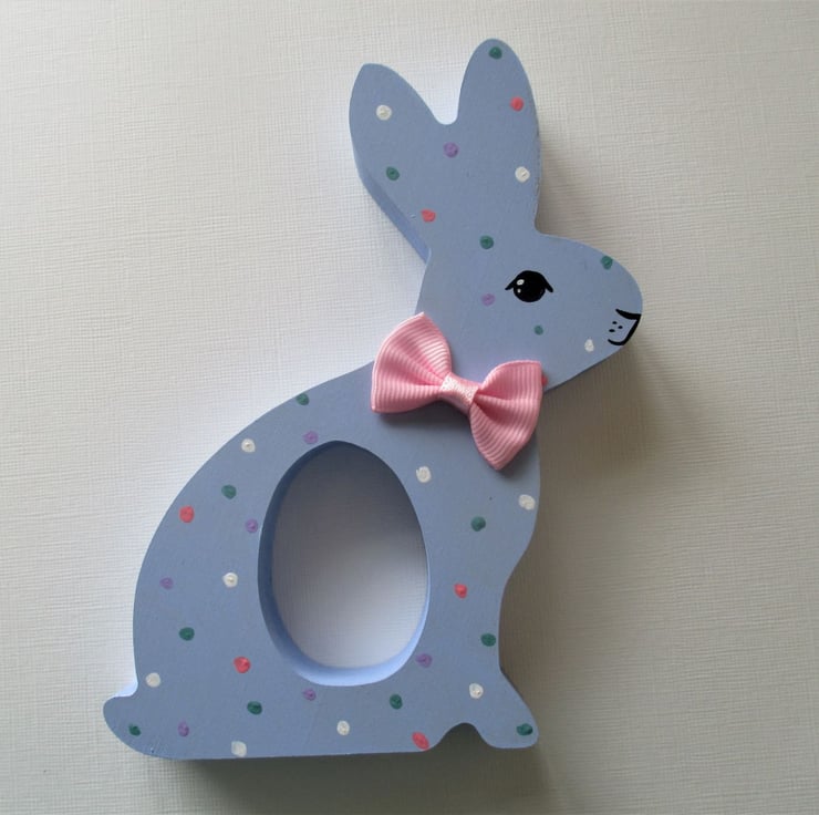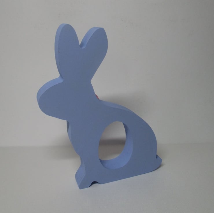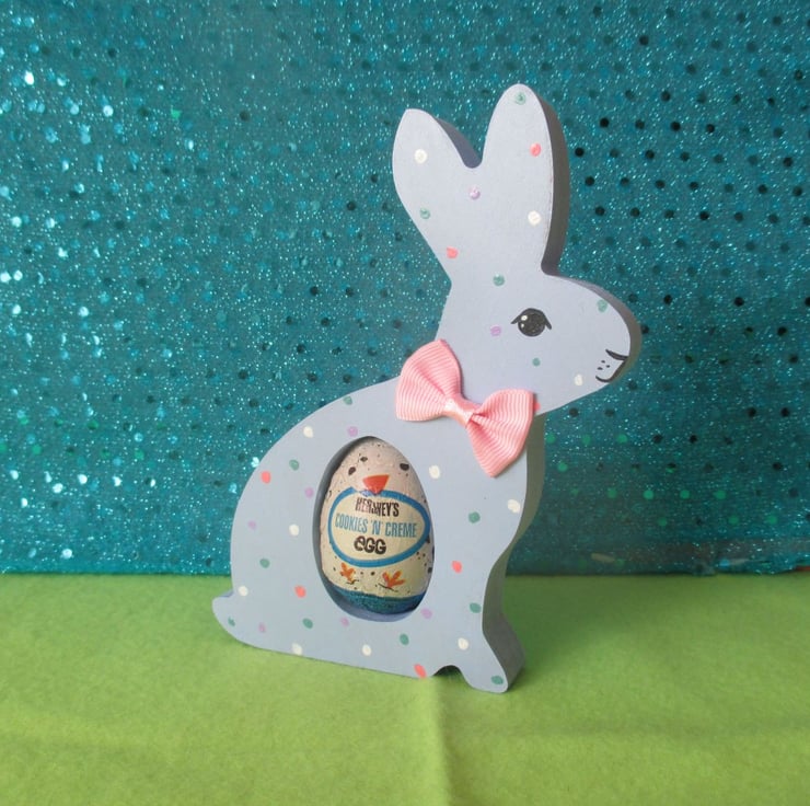This is a freestanding MDF bunny, which holds a chocolate egg (Creme egg etc - see photos for examples of the eggs that fit).