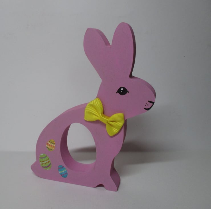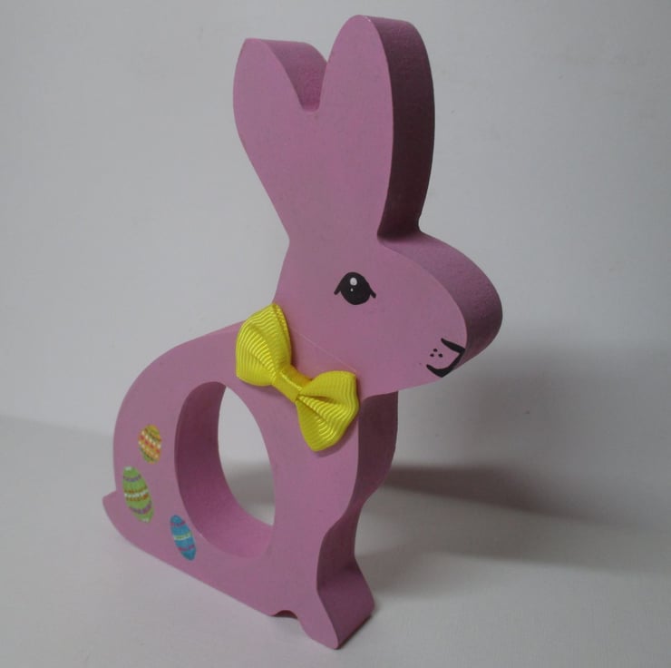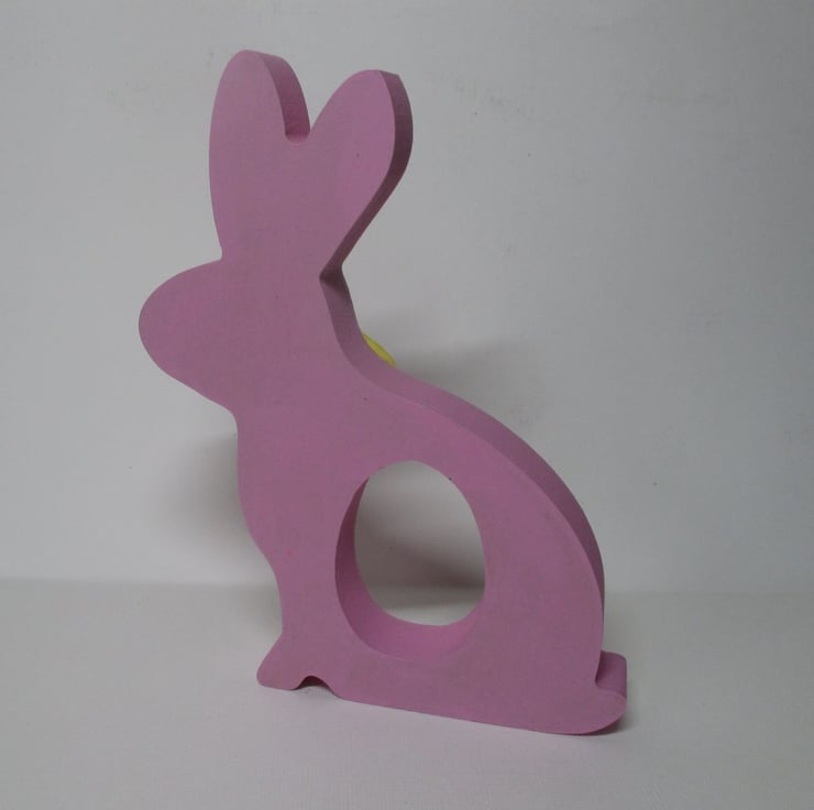 This is a freestanding MDF bunny, which holds a chocolate egg (Creme egg etc - see photos for examples of the eggs that fit).