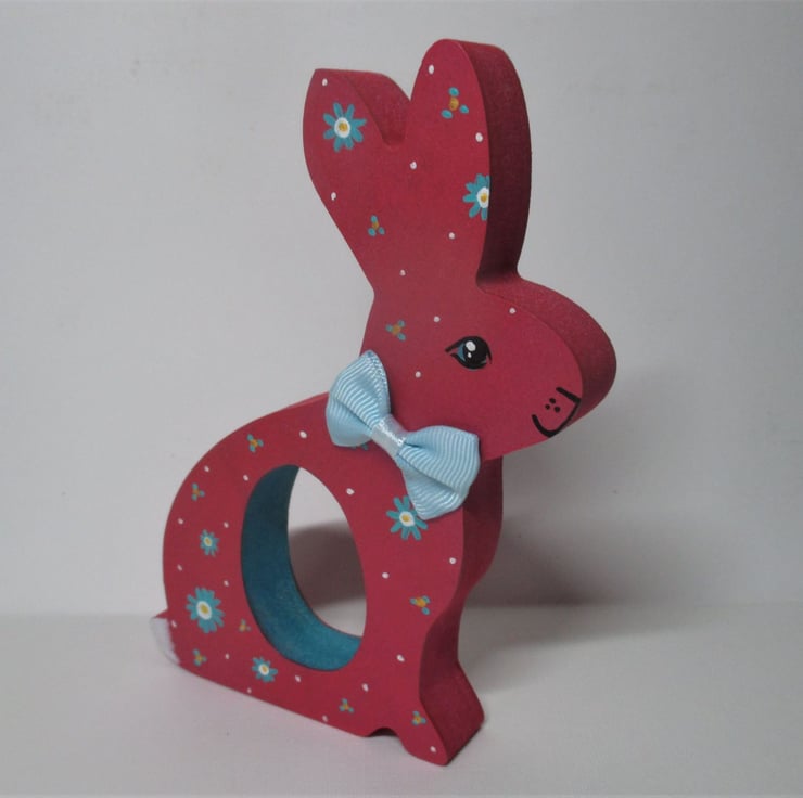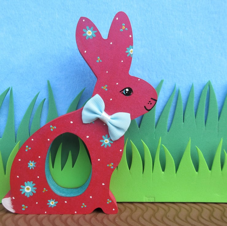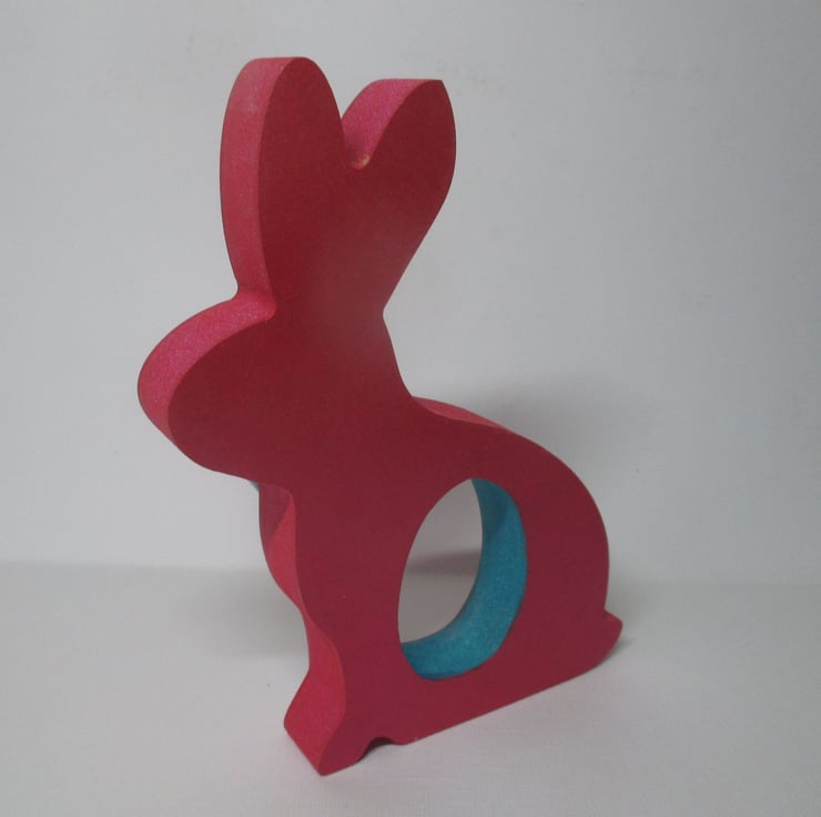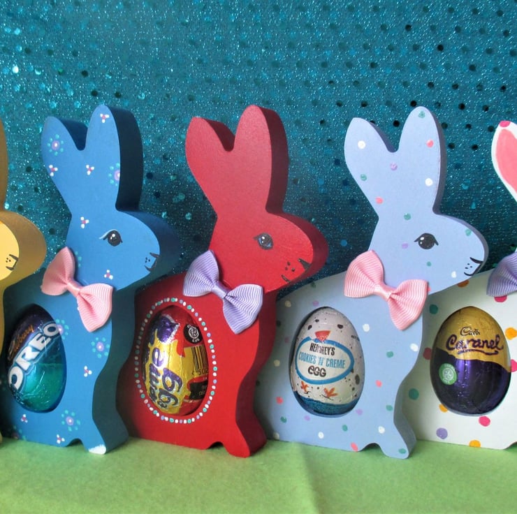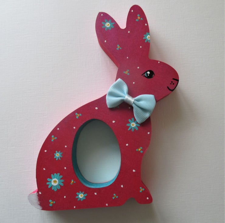This is a freestanding MDF bunny, which holds a chocolate egg (Creme egg etc - see photos for examples of the eggs that fit).
