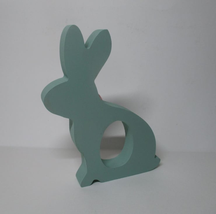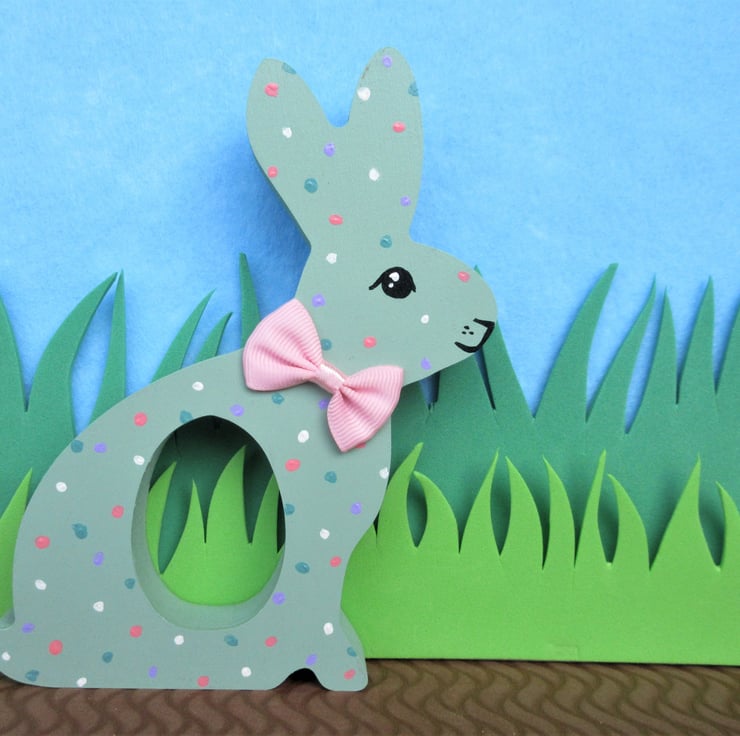 This is a freestanding MDF bunny, which holds a chocolate egg (Creme egg etc - see photos for examples of the eggs that fit).
