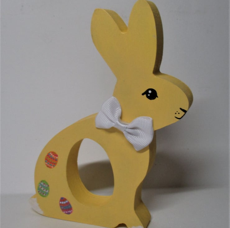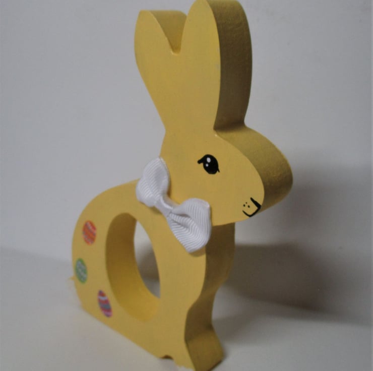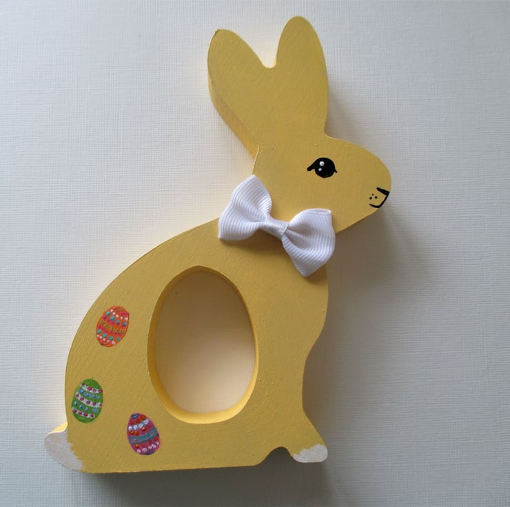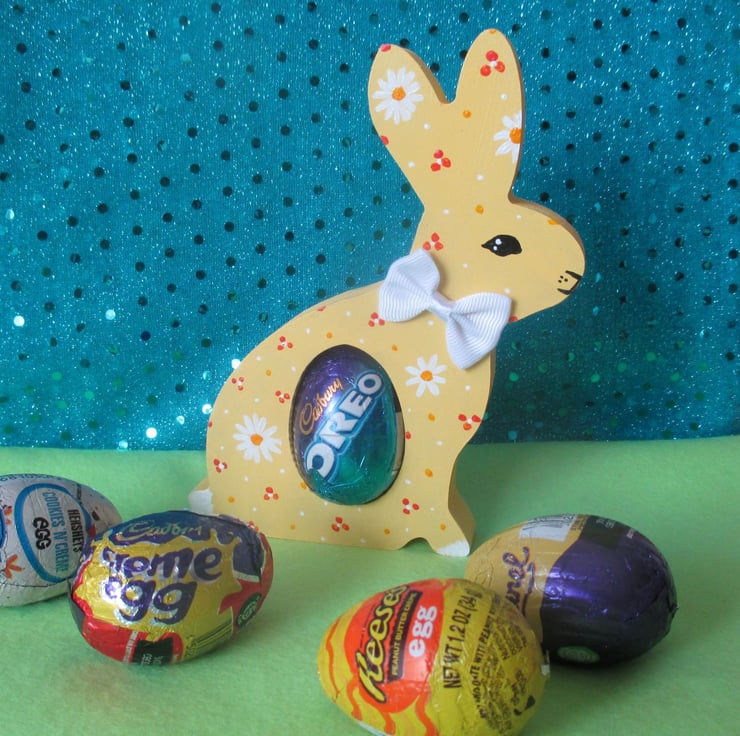 This is a freestanding MDF bunny, which holds a chocolate egg (Creme egg etc - see photos for examples of the eggs that fit).