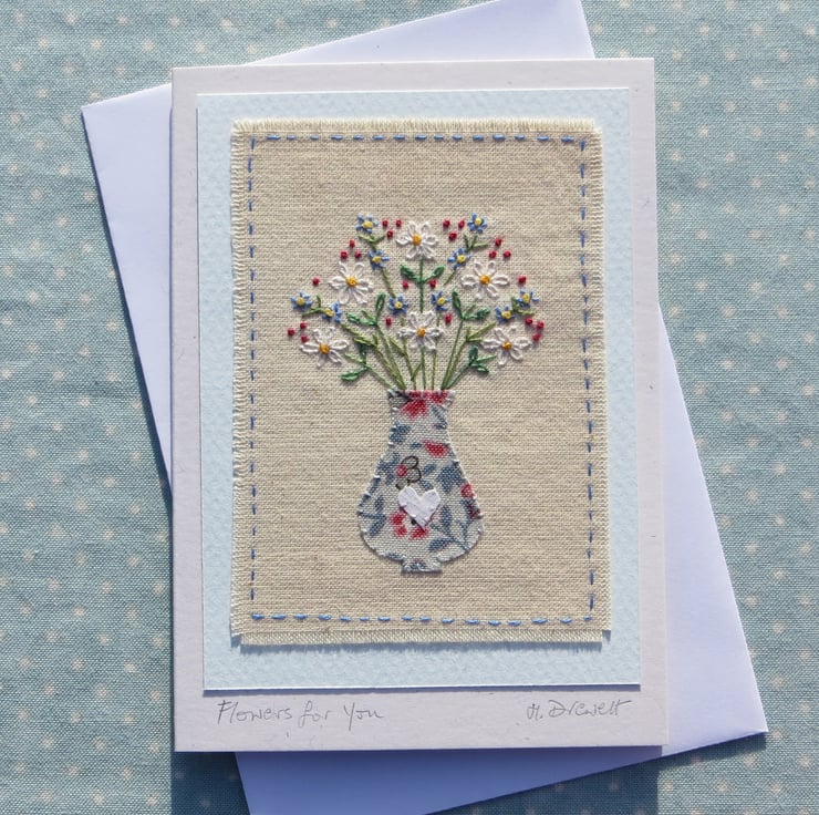 I love to sit with a needle and fine colourful threads and just stitch straight onto the cloth and see what emerges! These little flowers were made that way and when complete I added a little applique vase for them with tiny heart. This greeting card could be a gift in itself to keep and frame, as well as a card in which to write your message.