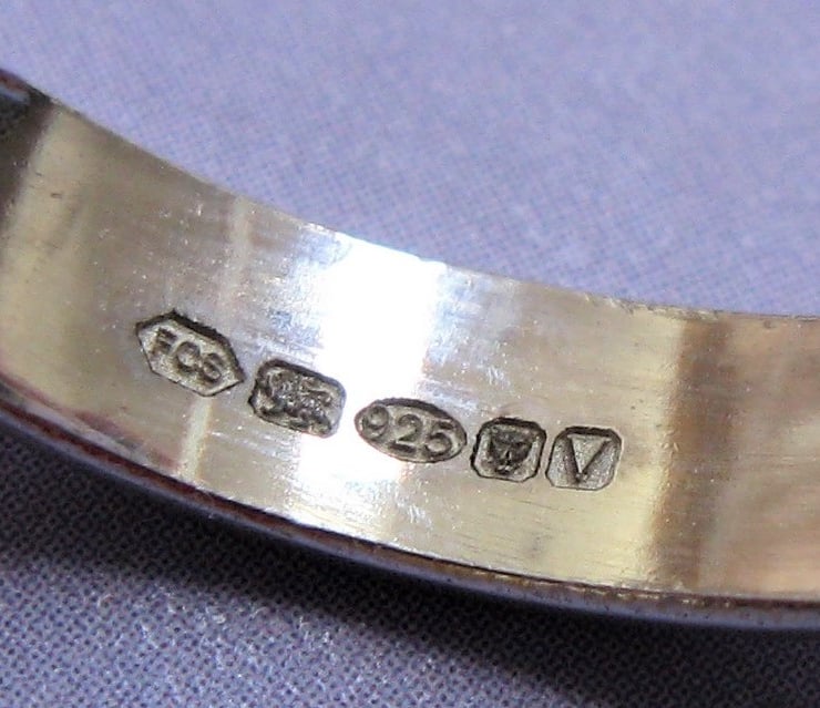 The band is 6 mm in width and the ring is between a UK size P and Q. (It is slightly closer to a Q but as it has a wide band size it will be easier to get on/off if you are between a P and a Q.) The ring is hallmarked 925 sterling silver.