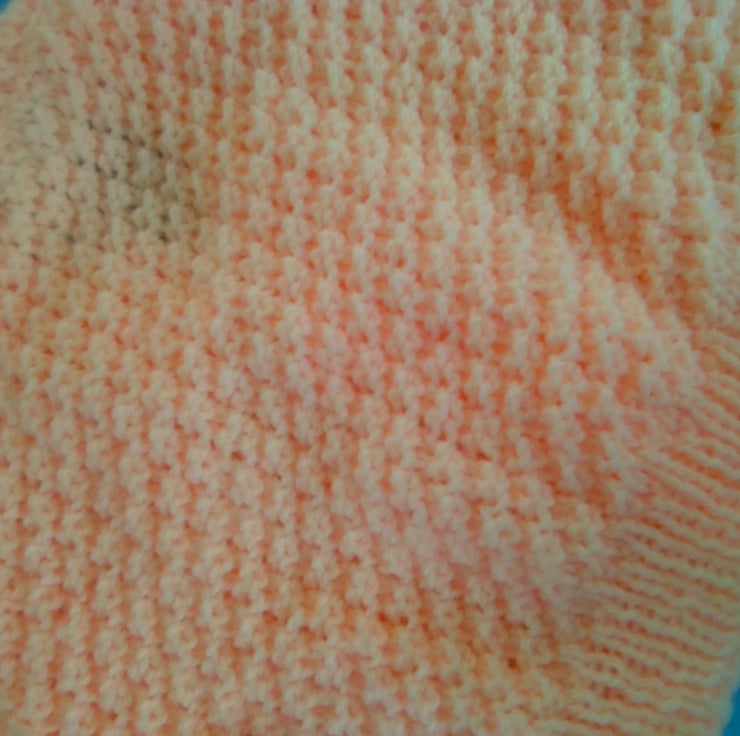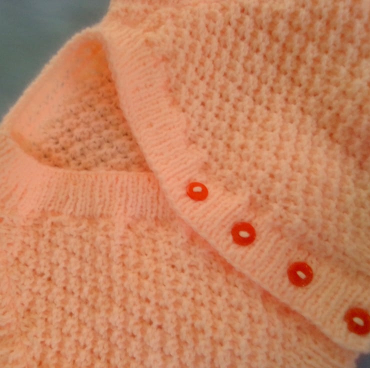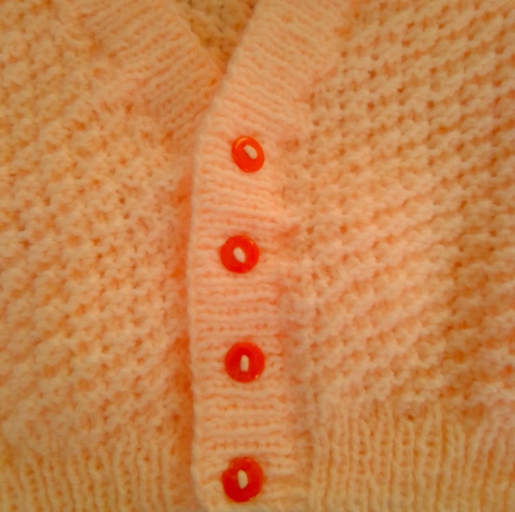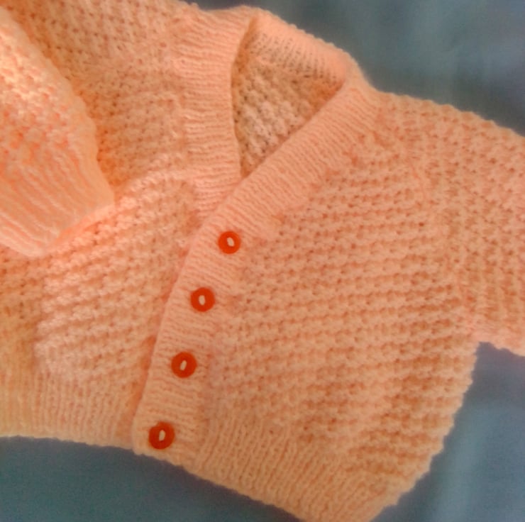 Very pretty moss stitch patterned cardigan with raglan sleeves and long sleeves which would suit either a boy or a girl hand knitted in 4 ply yarn. It is in stock in the pretty peach colour shown to fit a 0 - 3 month old baby with a 16" chest. It can also be made for you in your choice of colour and size, just let me know the colour required when you order. The processing time will be between 1 and 2 weeks to make it and send out to you.