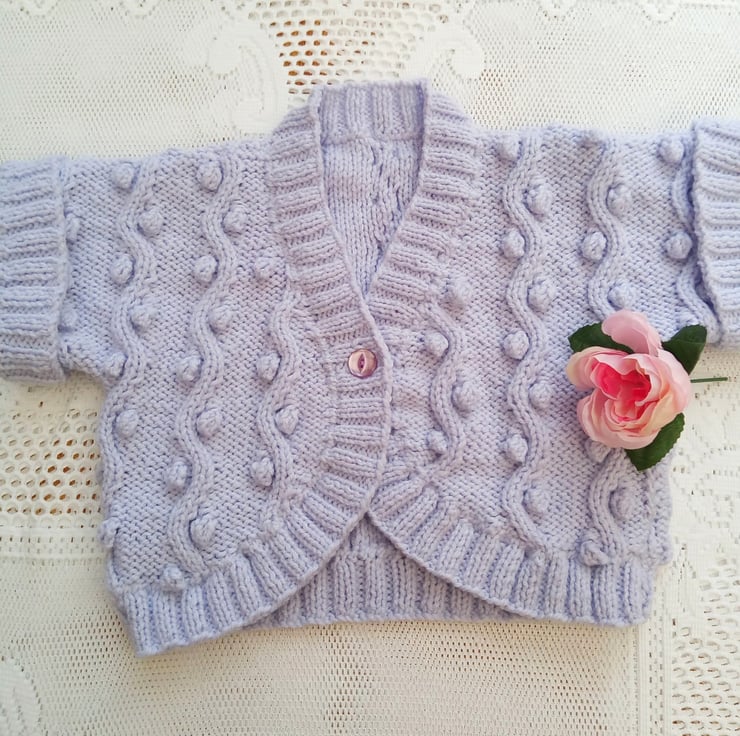 Girls Bolero with a bobble aran pattern, photos show garment in a choice of lemon, pale green and lilac aran weight yarn. It can be made in a colour of your choice, most colours are available. Available sizes are shown at the bottom of this listing.