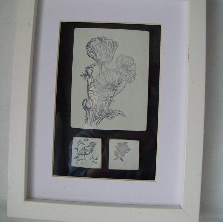 For this piece I used air dried clay which I made into tiles, impressed them with flowers and a bird in black ink then attached them to the back panel which I sprayed black to make the tiles stand out.
